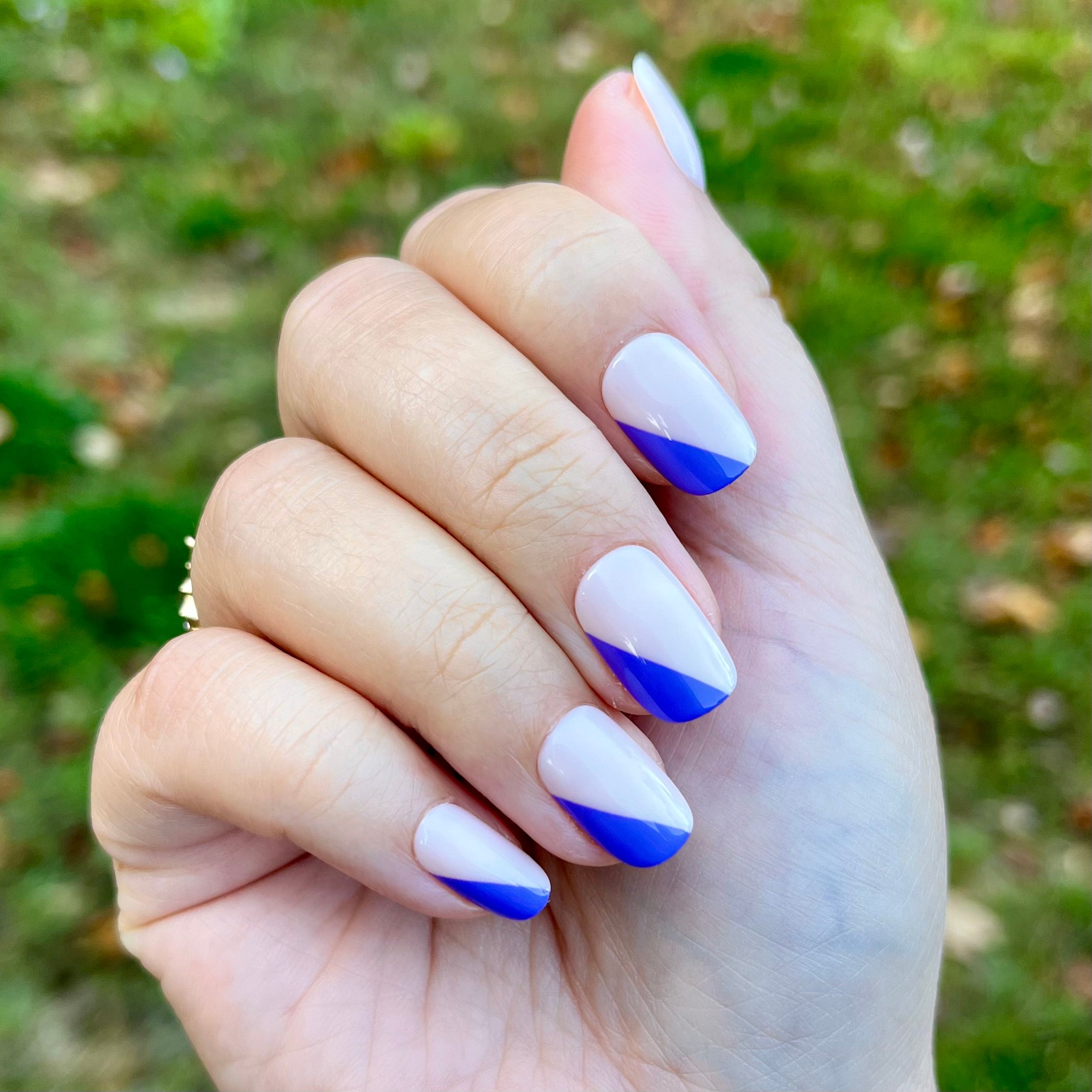 An asymmetrical indigo French mani.