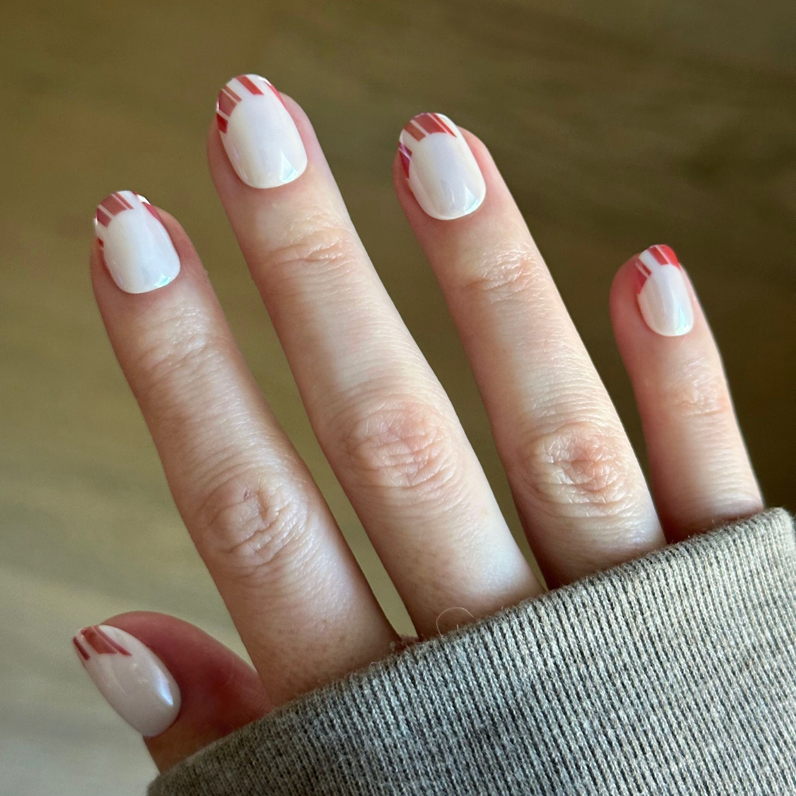 A shimmering neutral mani with a sweet peppermint candy cane tip in an extra short round shape.