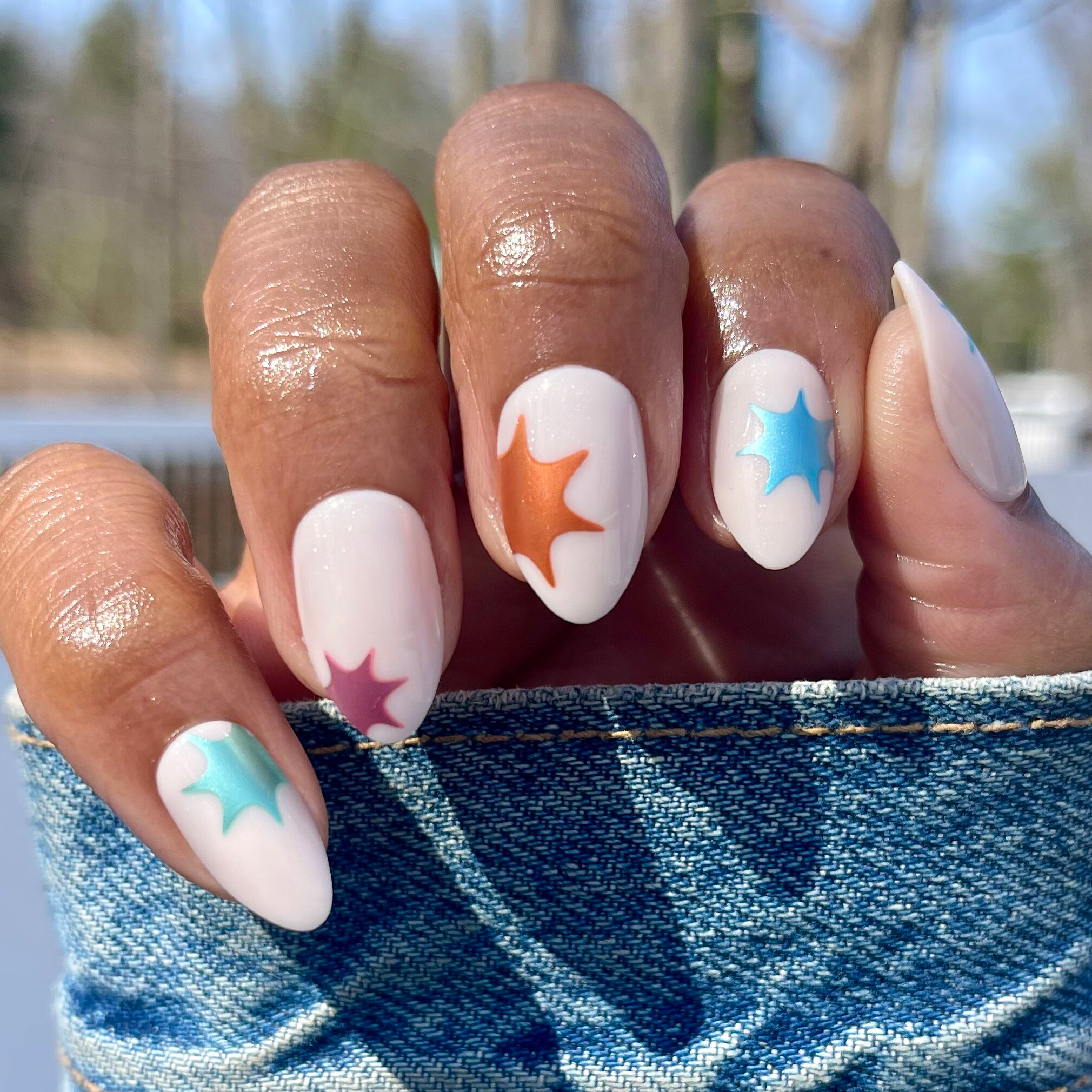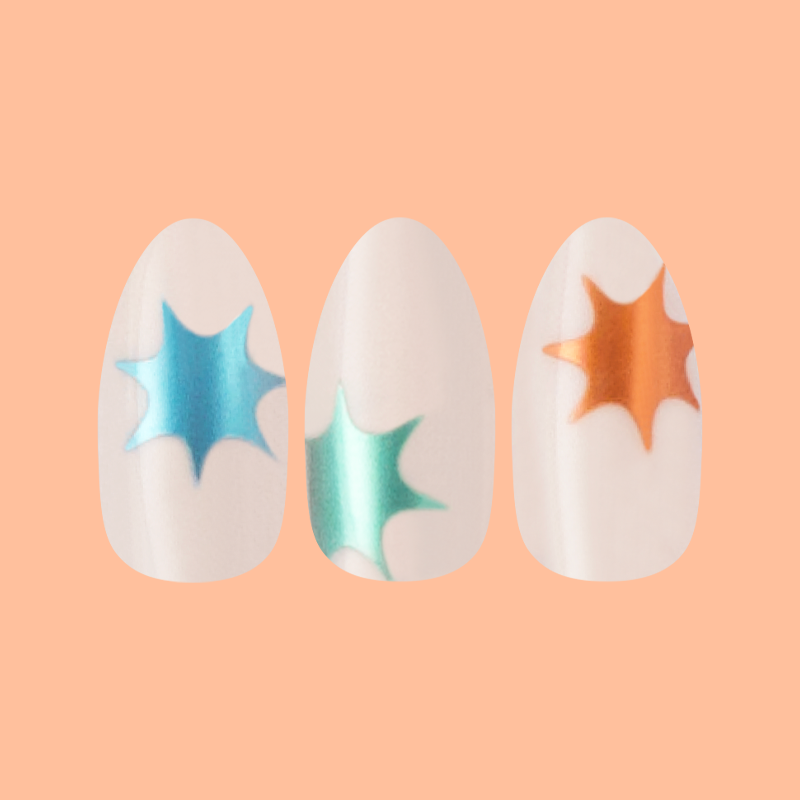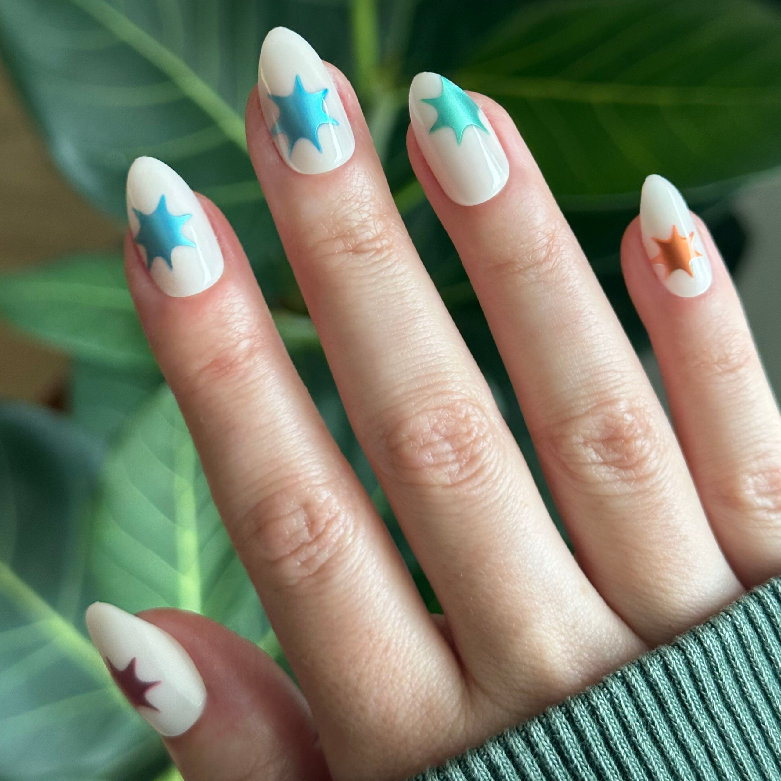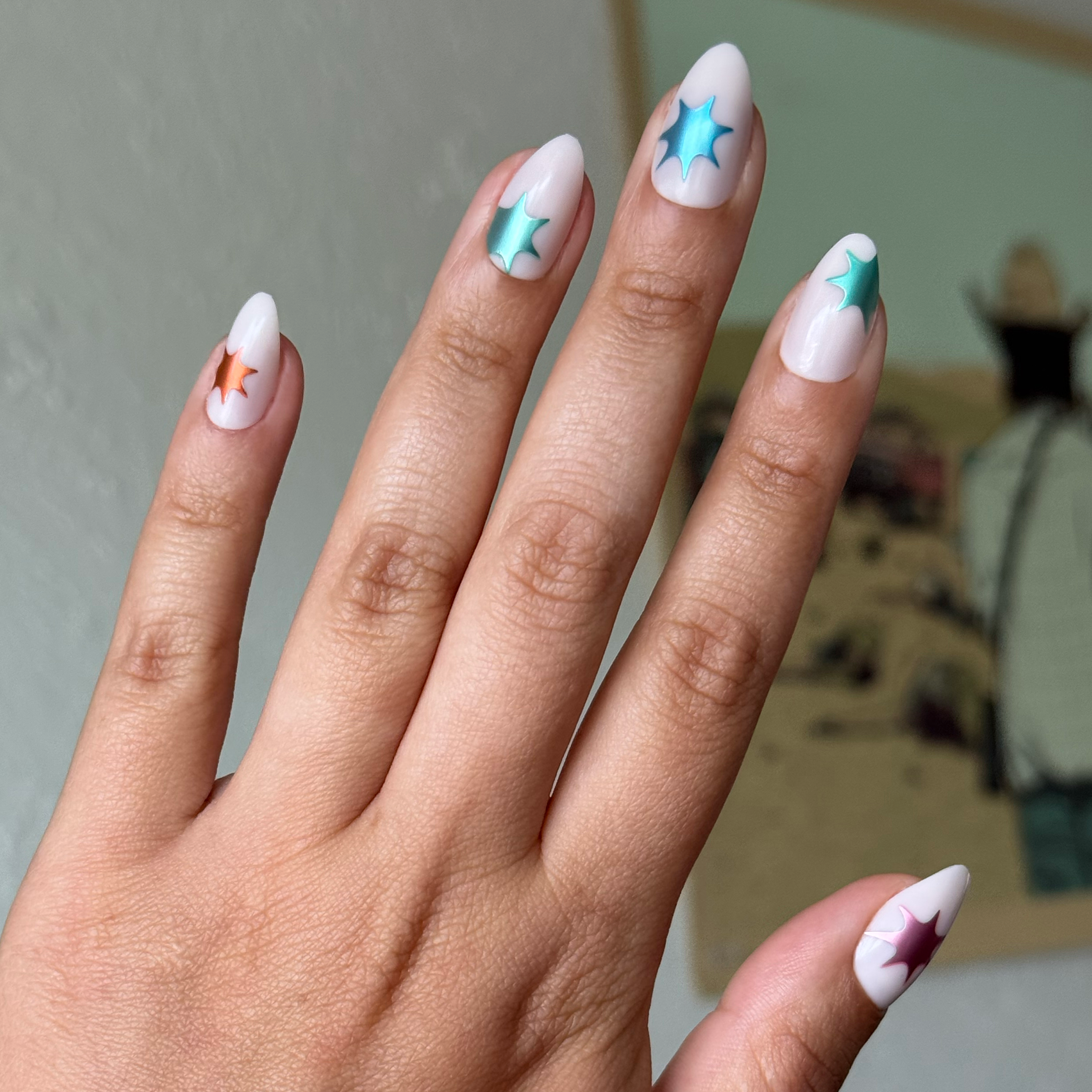 A neutral mani topped with colorful bursts of chrome in a medium almond shape.