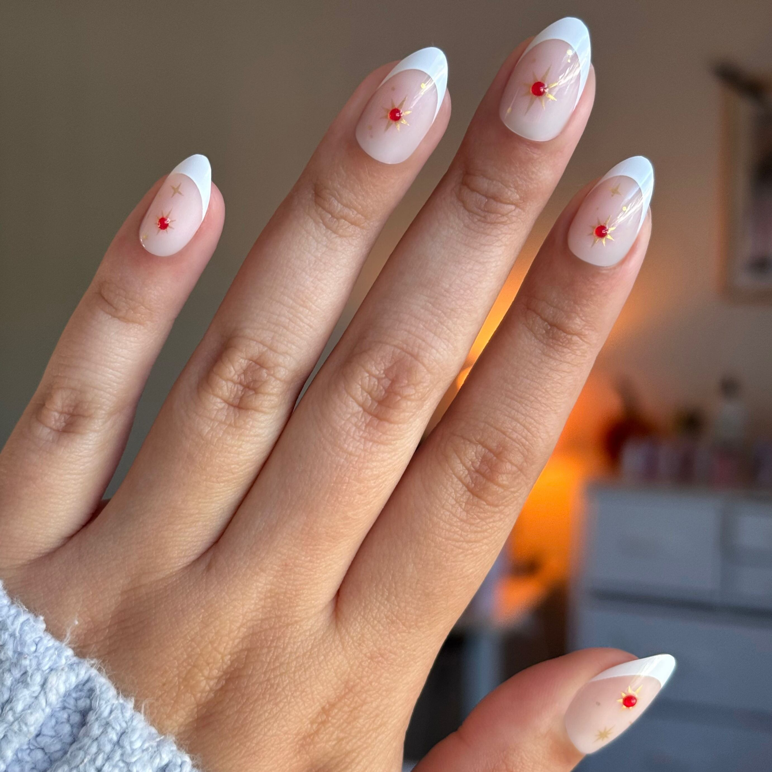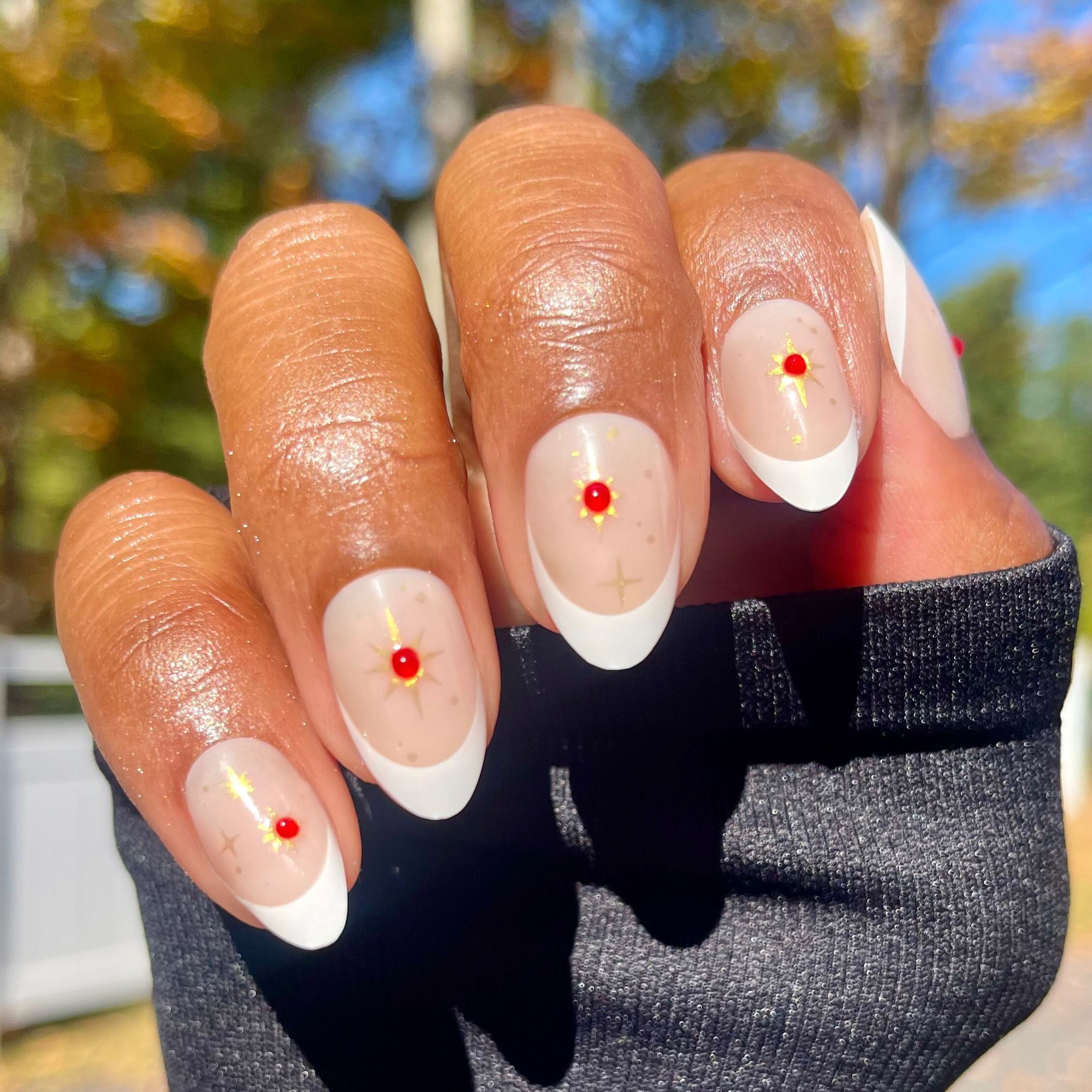 A classic french tip mani accented with 3D puffy red gems and gold sparkles in a medium almond shape.