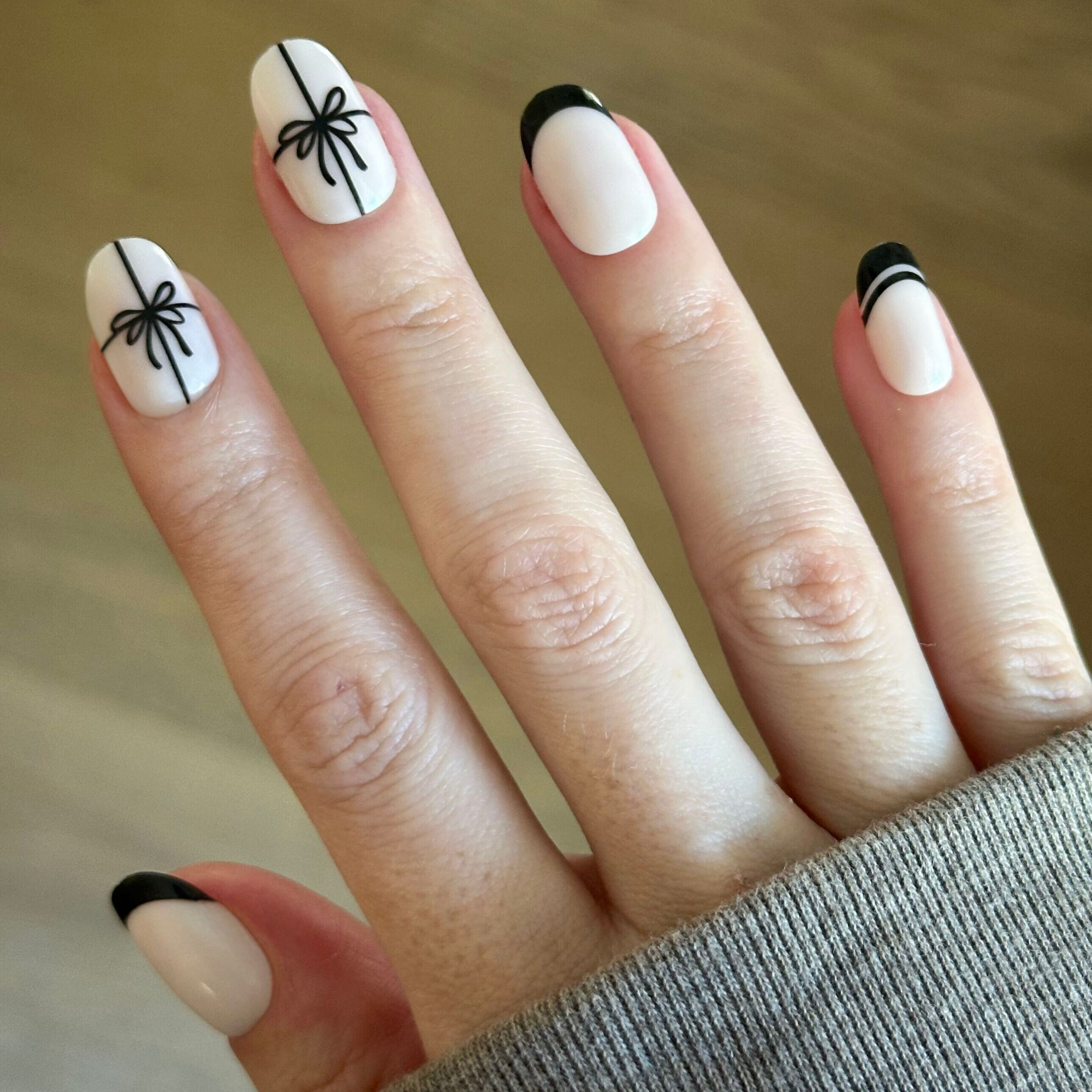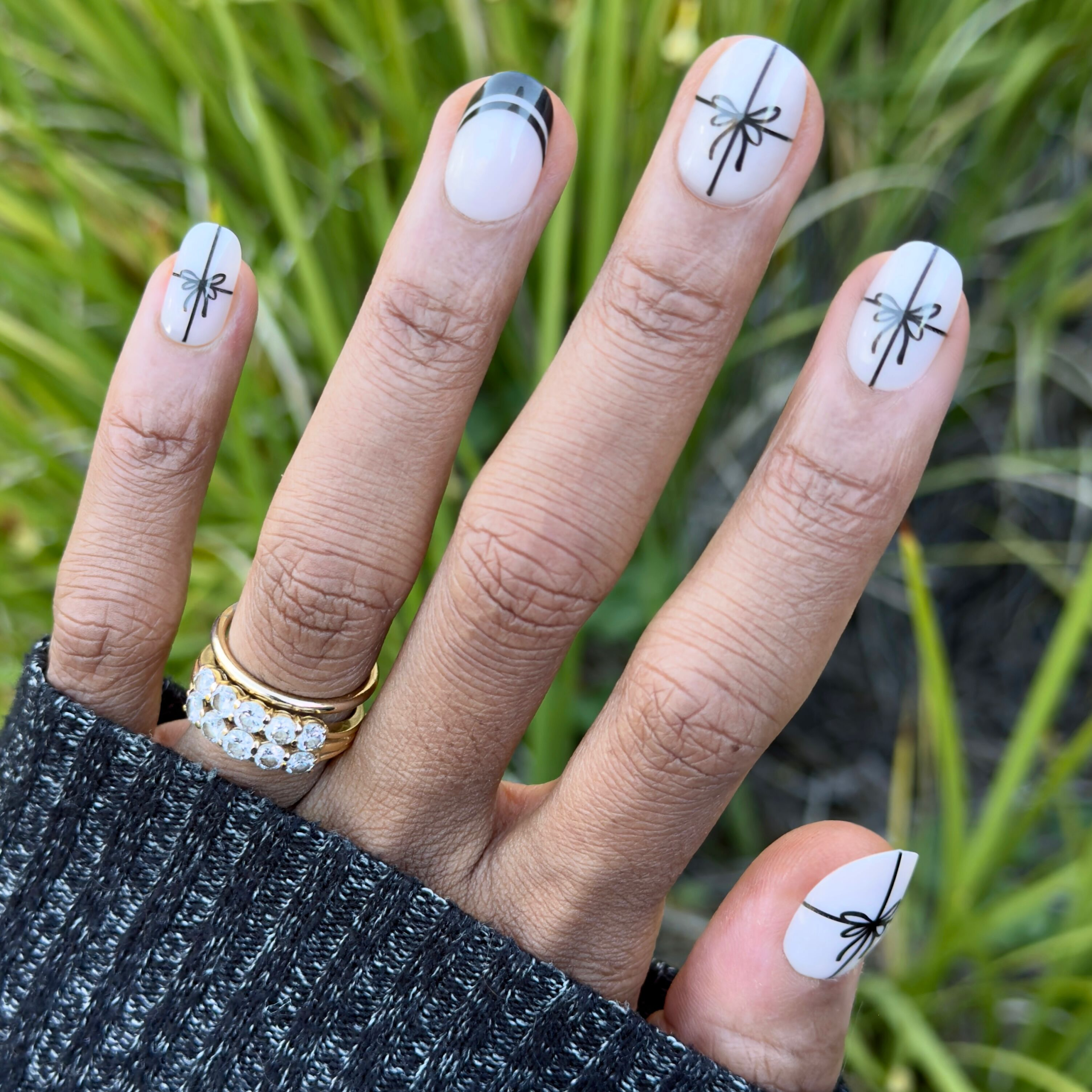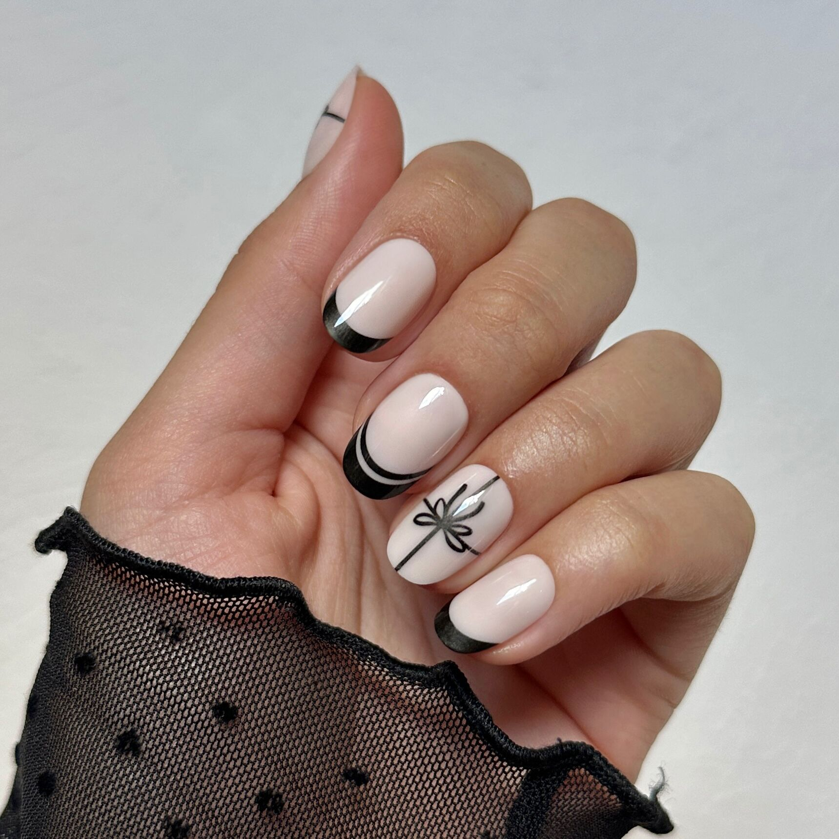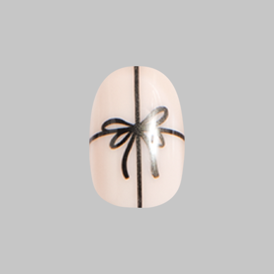 A neutral mixed mani accented with shimmering chrome bows and french tips in a short round shape.