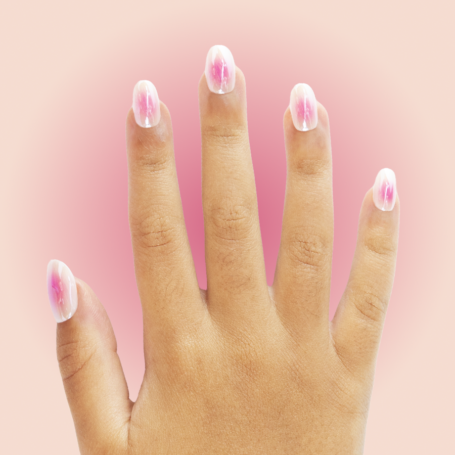 A pastel mani with a bright cotton candy pink aura effect in the middle. How do we make it even sweeter? It’s completely covered in shimmery chrome. obvi!