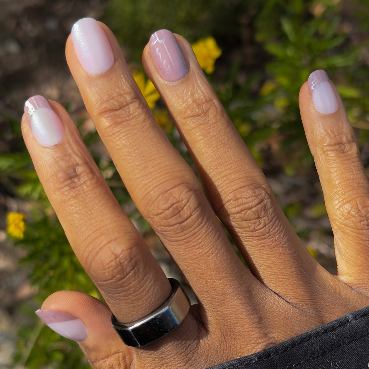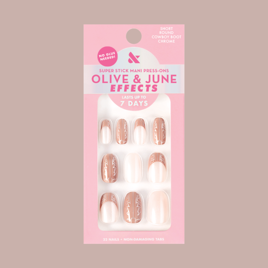 A western boot print mixed mani pack with a wash of shimmery chrome in a short round shape.