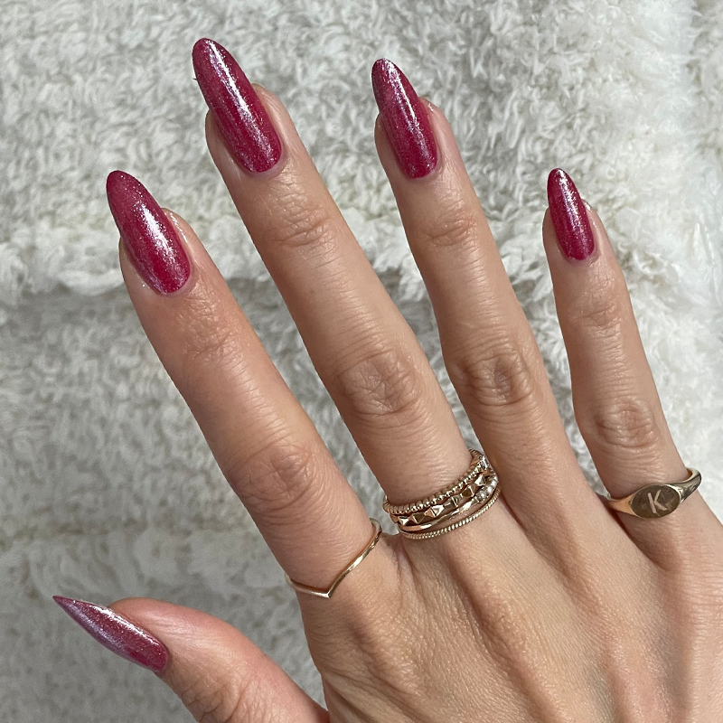 A deep burgundy mani with a shimmery velvet-like finish.
