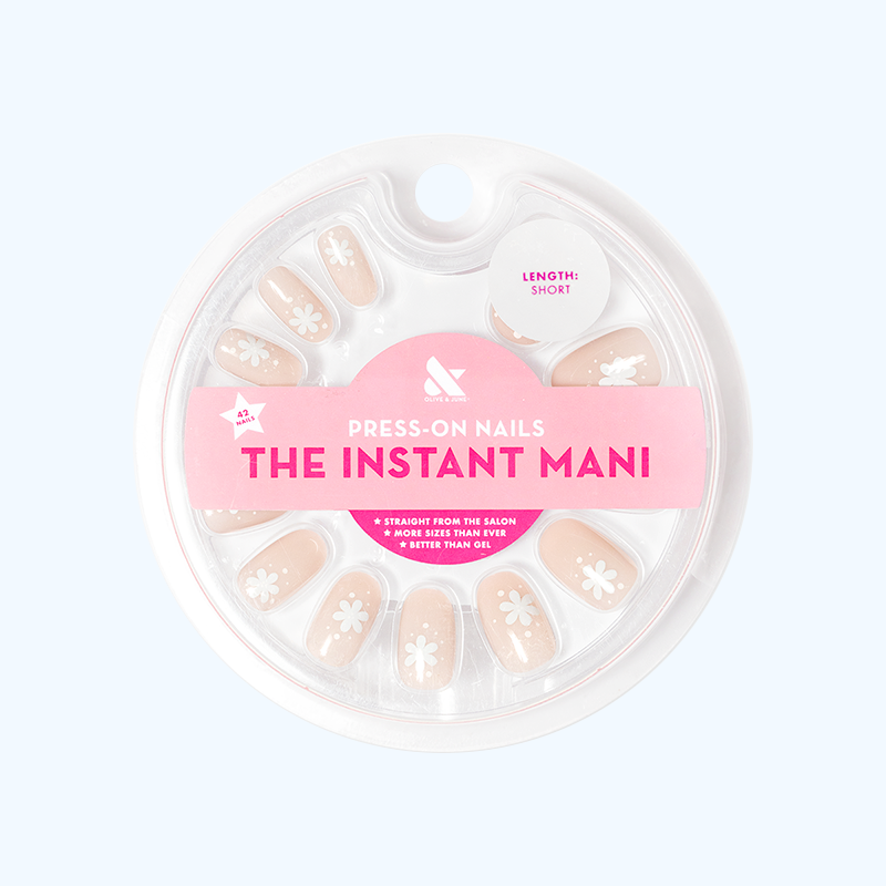 A neutral beige mani with floating daisies in a short round shape.