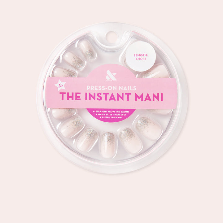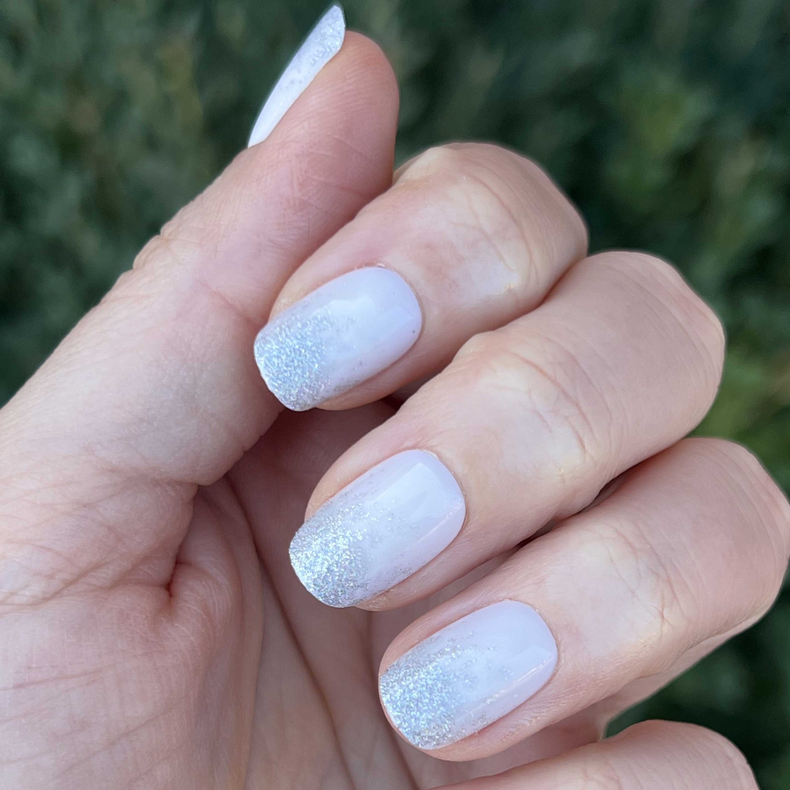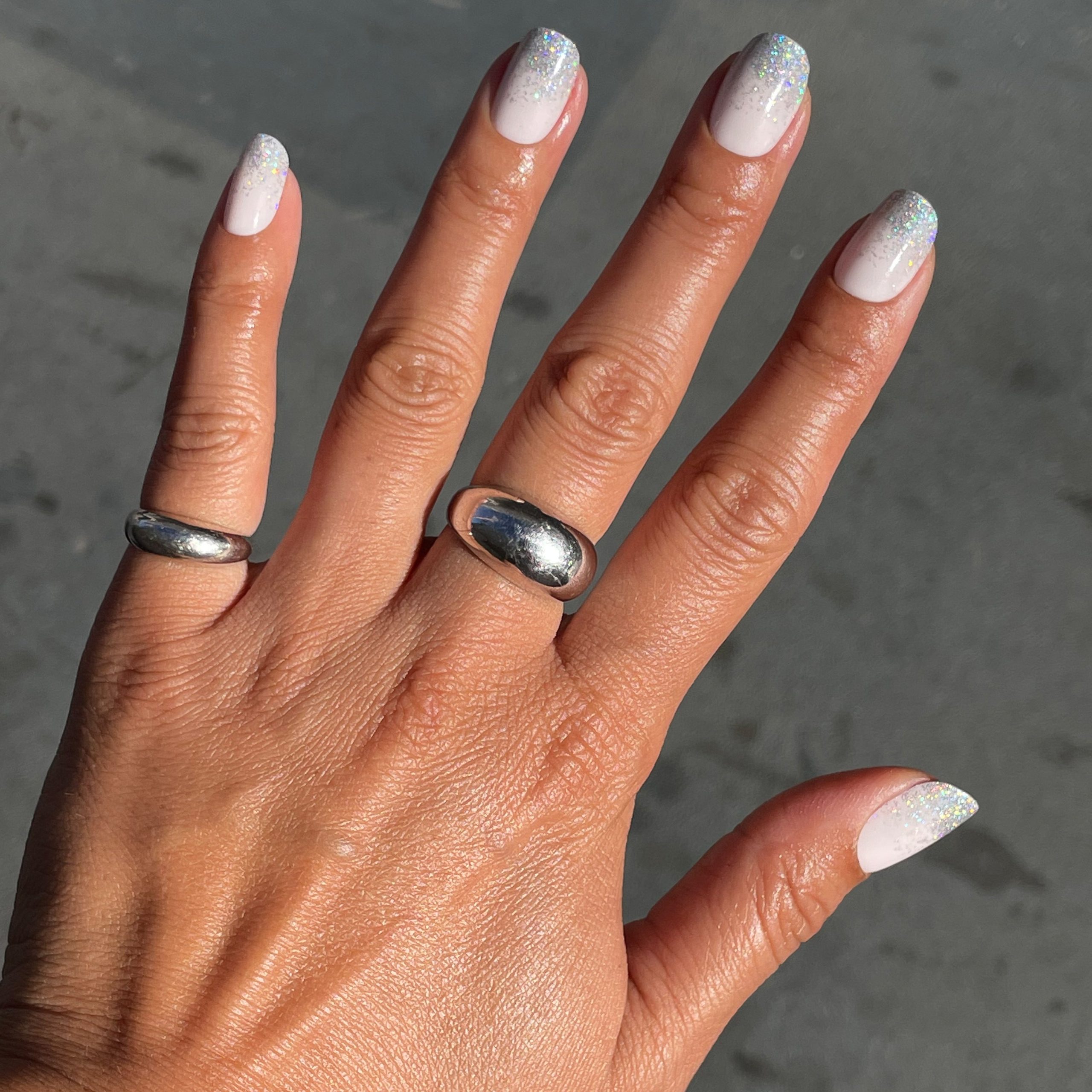A perfect gradient of silver glitter on a neutral Bunny Slope base in a short squoval shape.