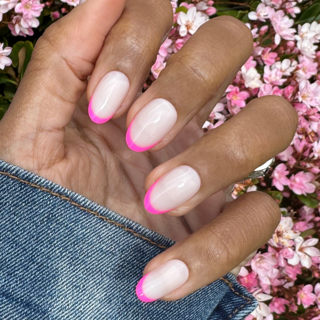A neutral mani accented by a hot pink french in a medium oval shape.