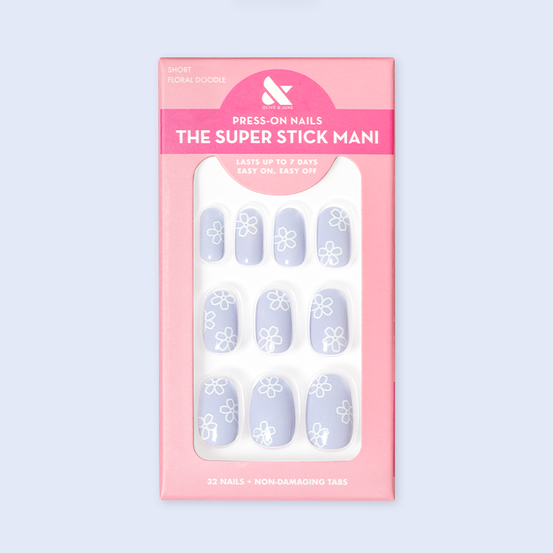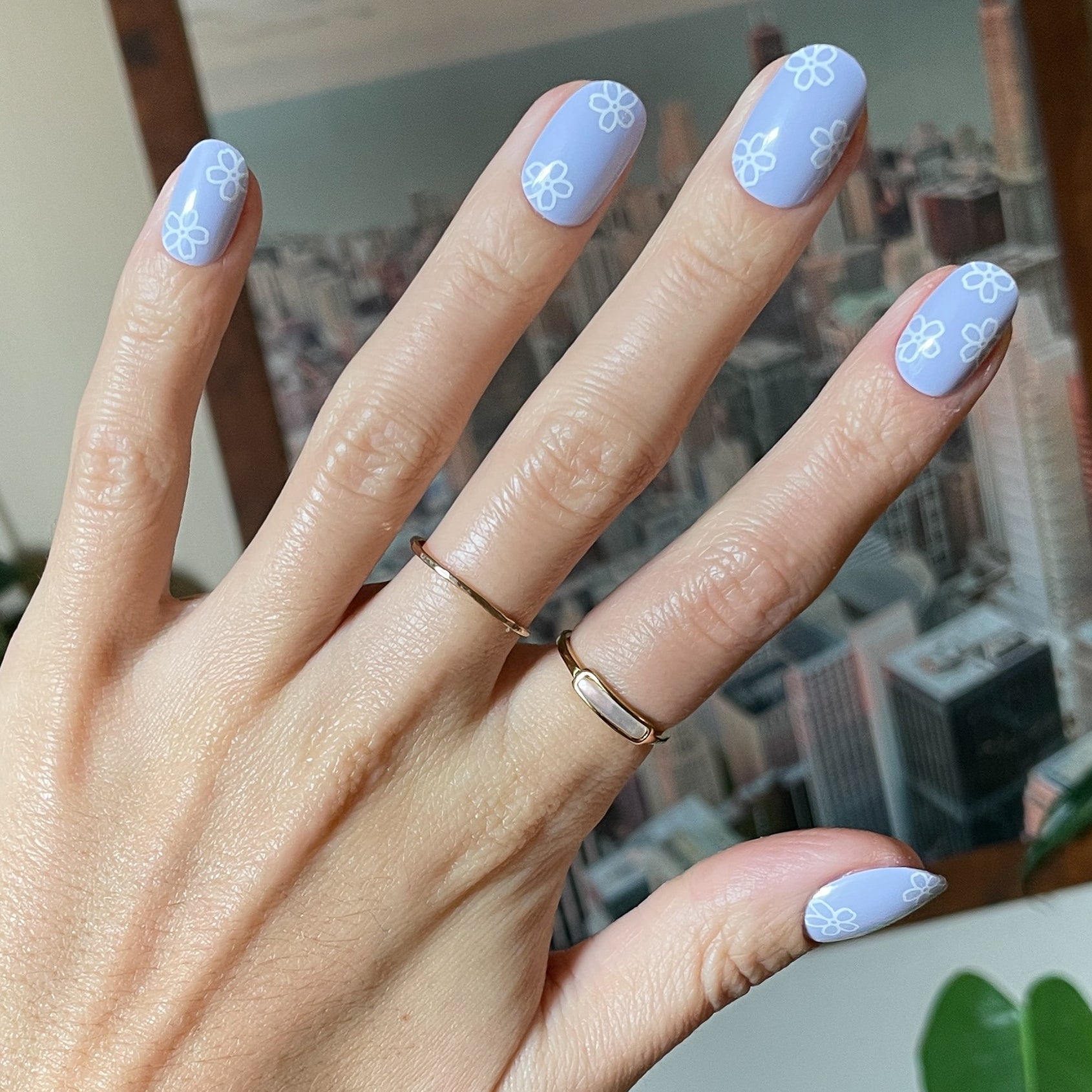 A light blue mani accented by white flower doodles.