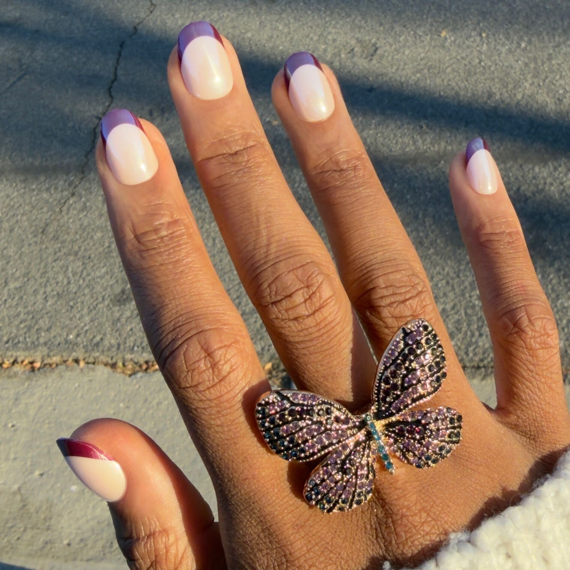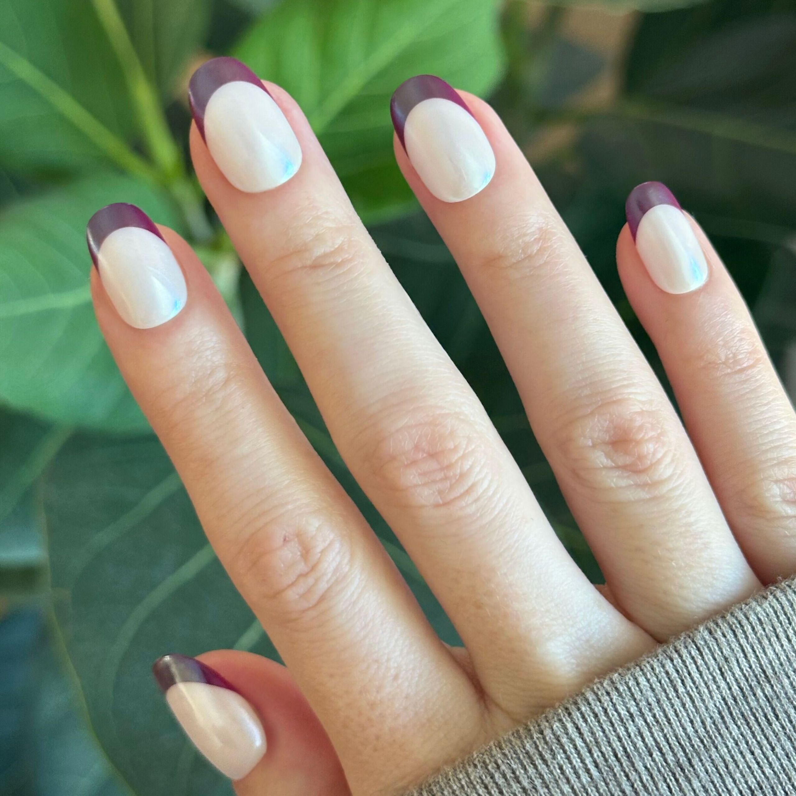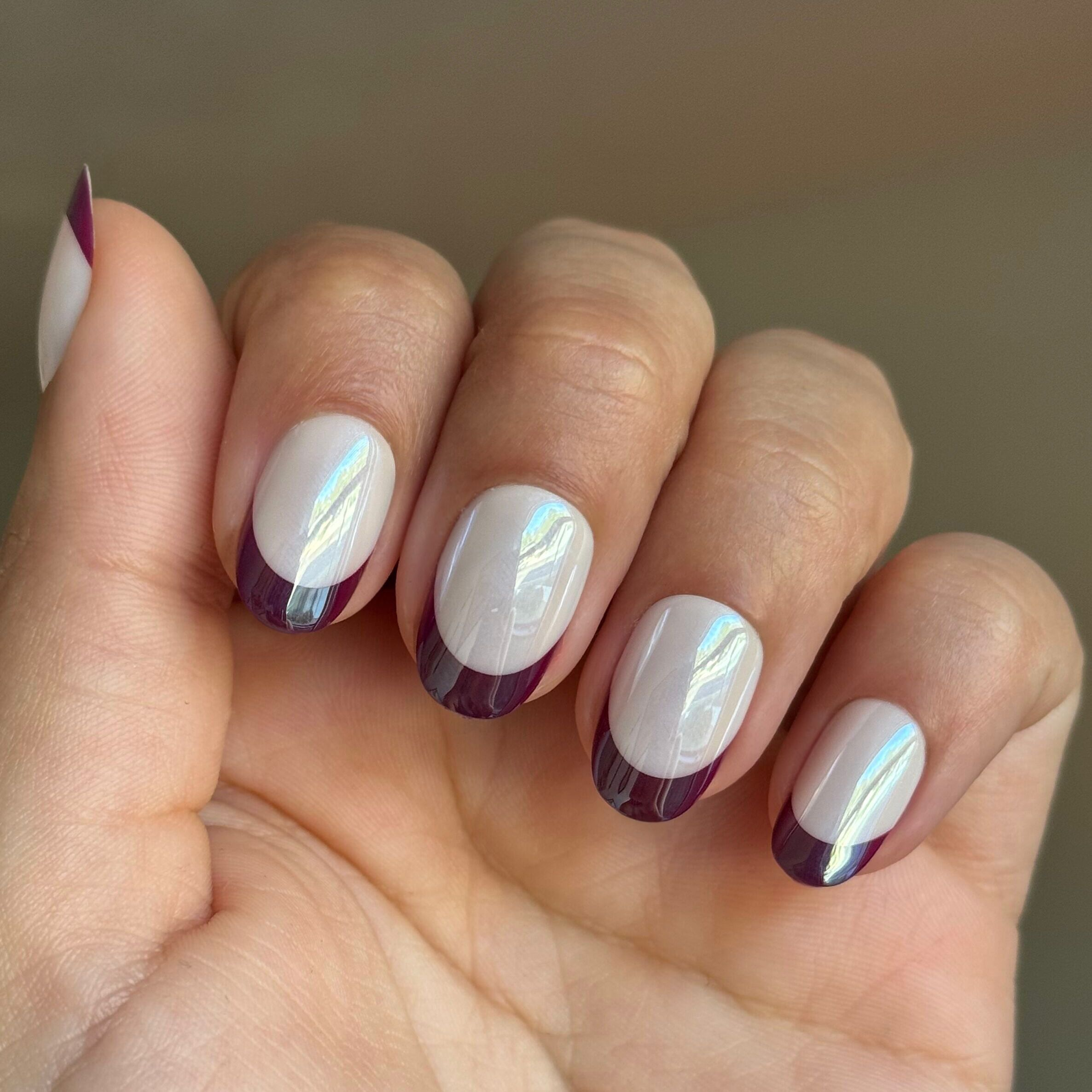 A classic neutral mani with a deep mulberry purple french tip topped with chrome in a short round shape.