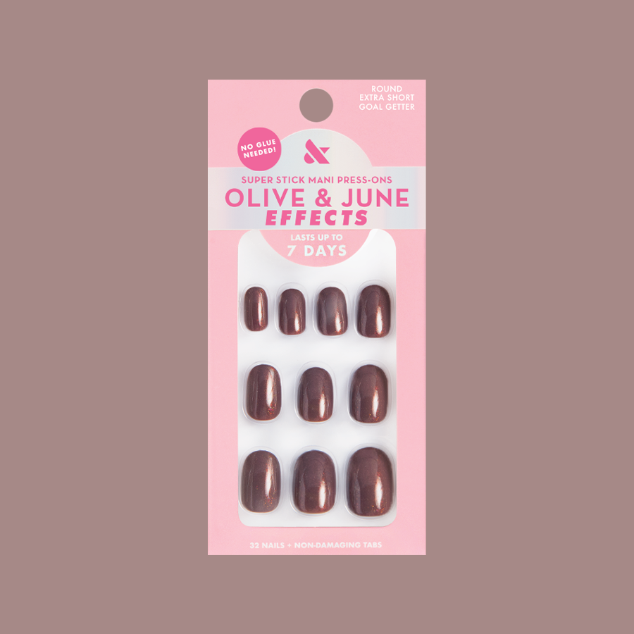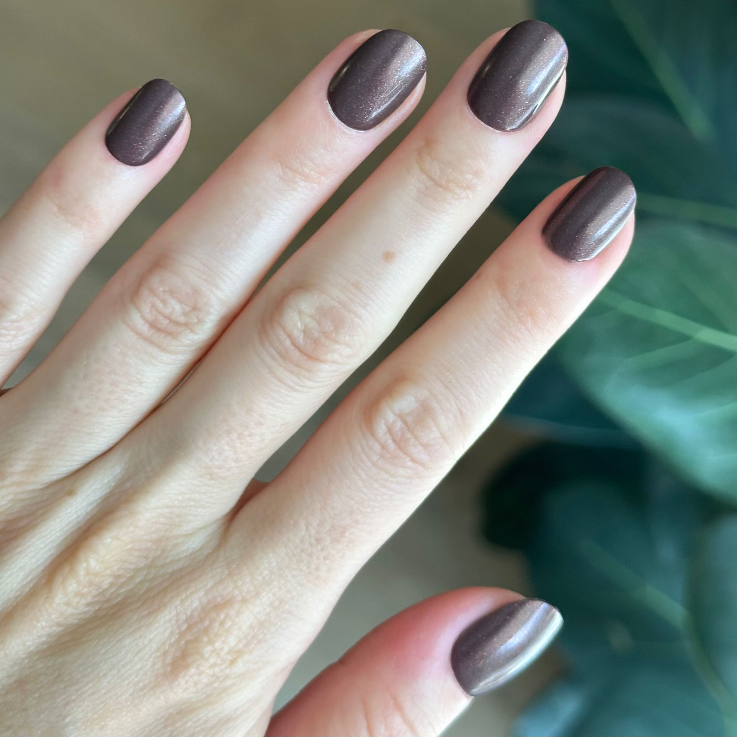 A chocolatey neutral with subtle golden brown shimmer in an extra short round shape.
