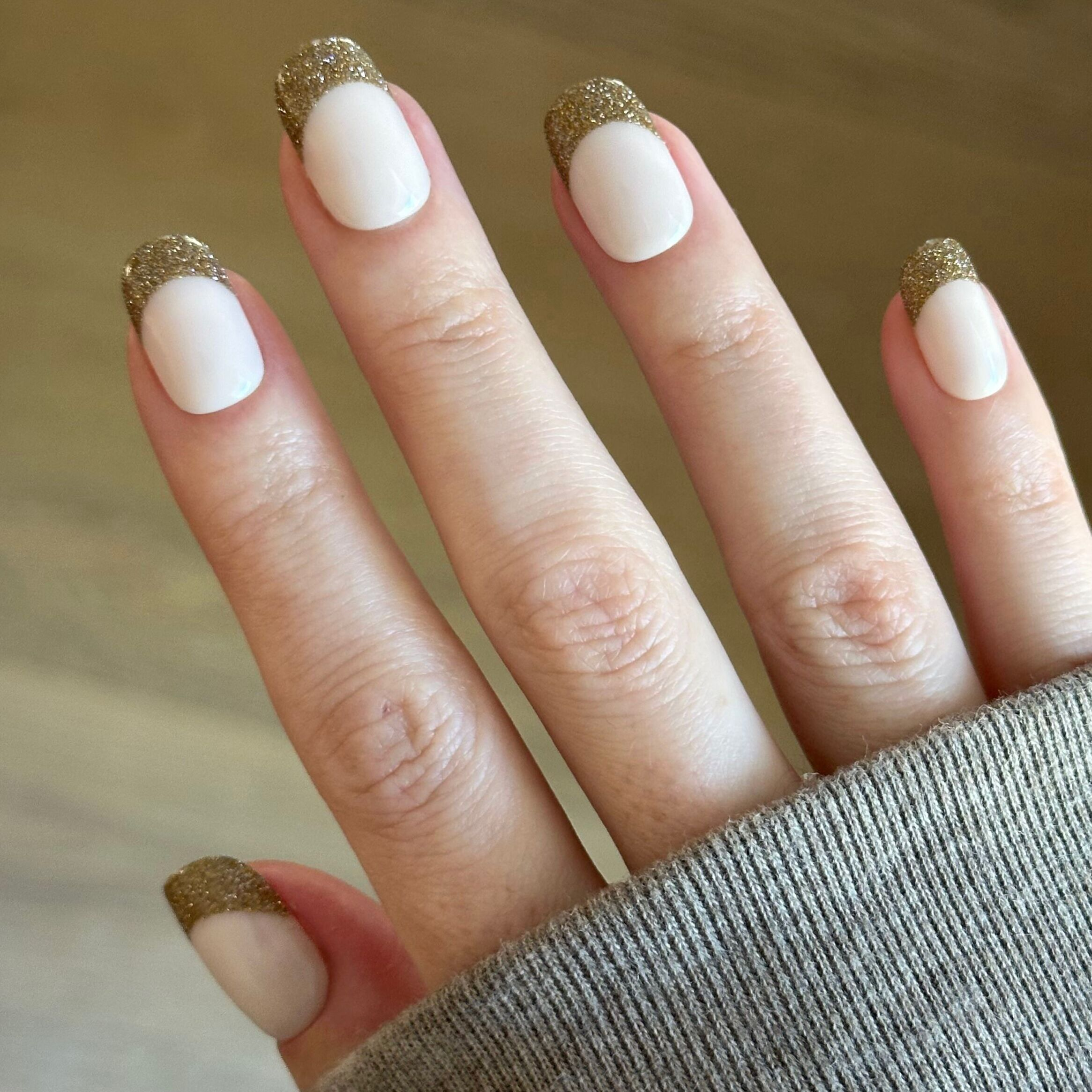 A classic neutral mani with a glitz gold french tip in a short squoval shape.