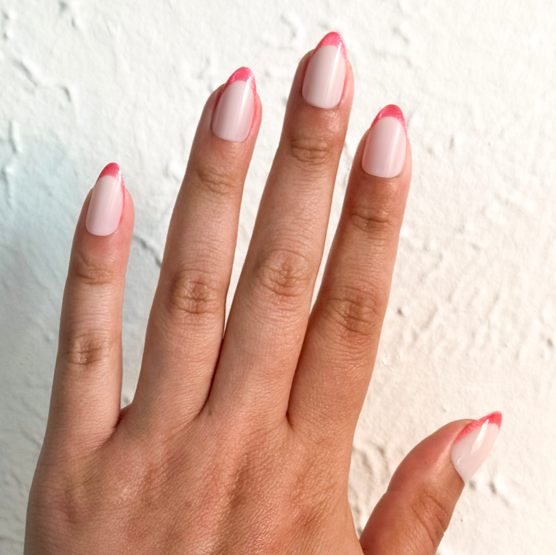 A neon pink french tip mani with a shimmering velvet effect in a medium almond shape.
