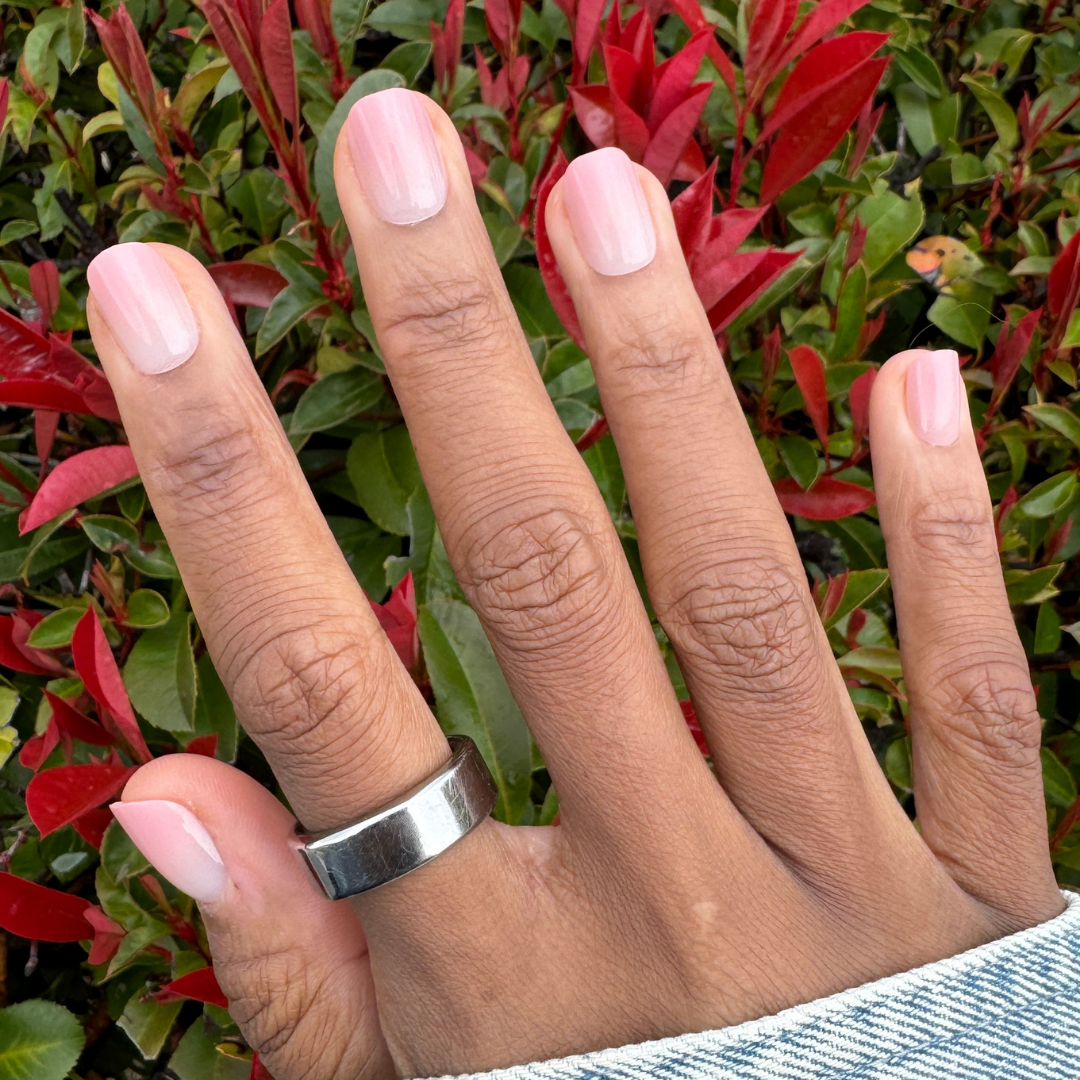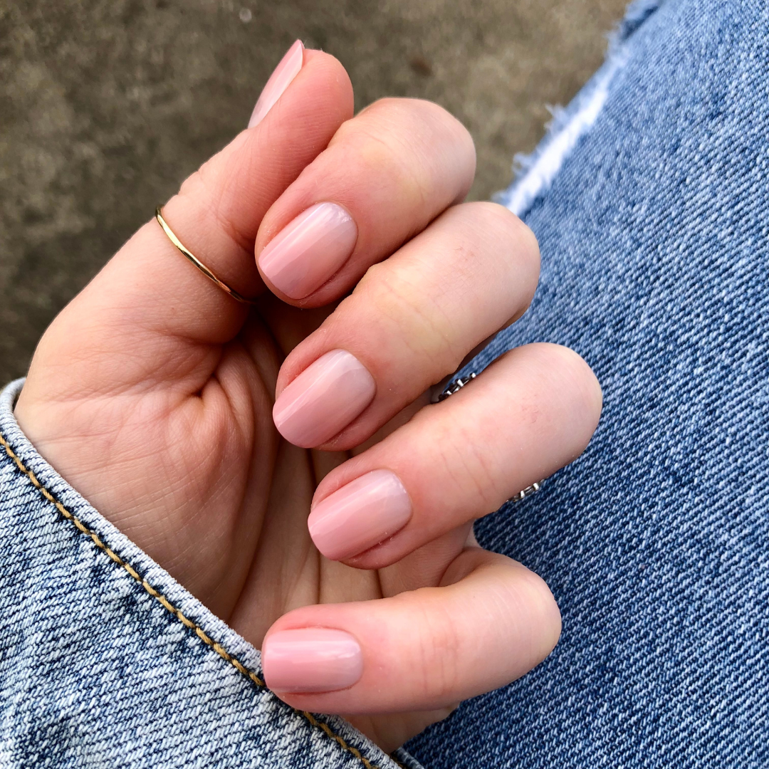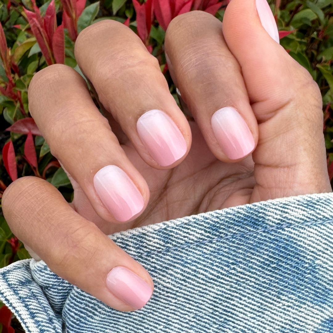 A rosey-beige neutral gradient manicure in an extra short squoval shape.