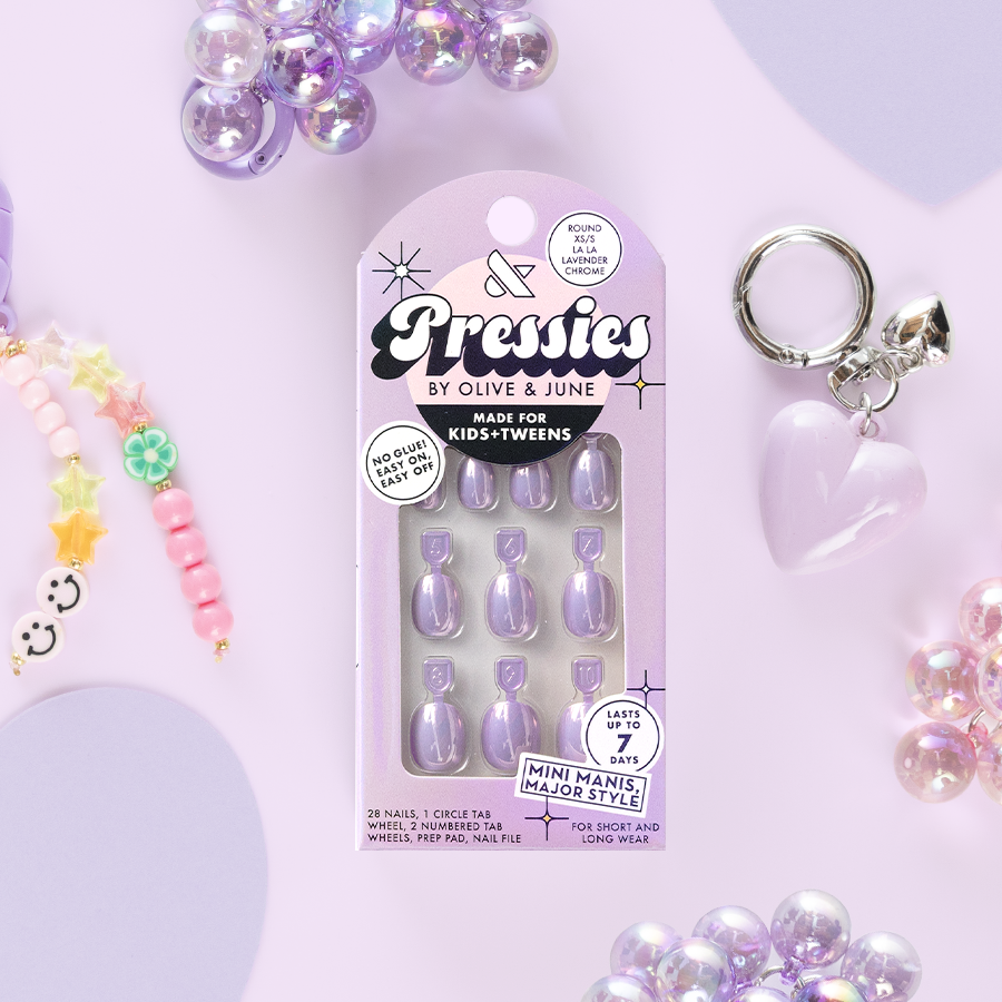 An ultra light lavender mani you’re sure to la la love that’s topped with ultra sparkly chrome that’s straight from the salon and so slay.
