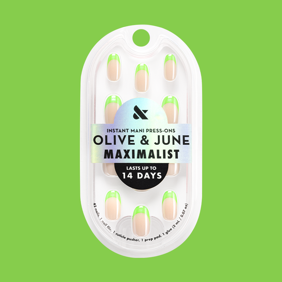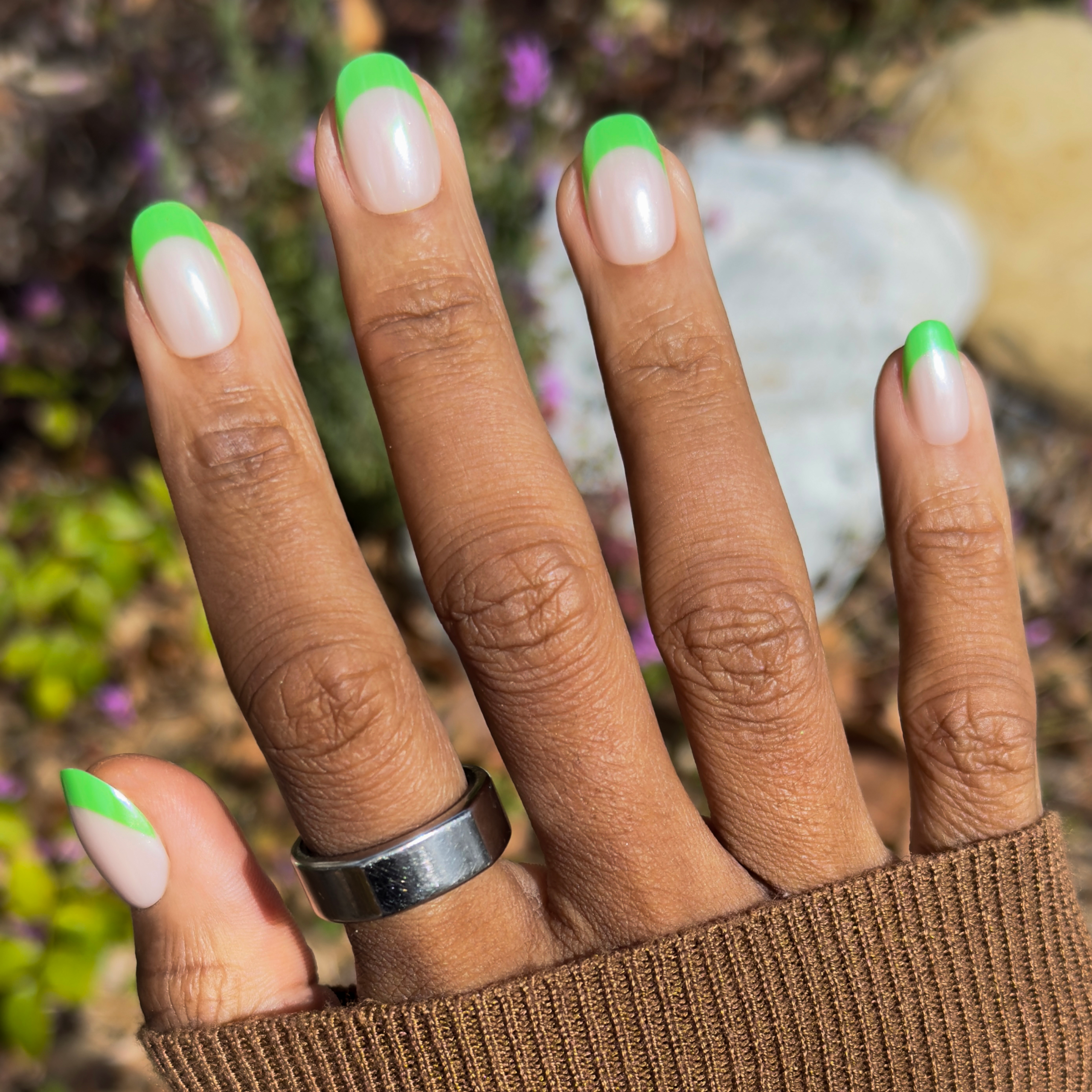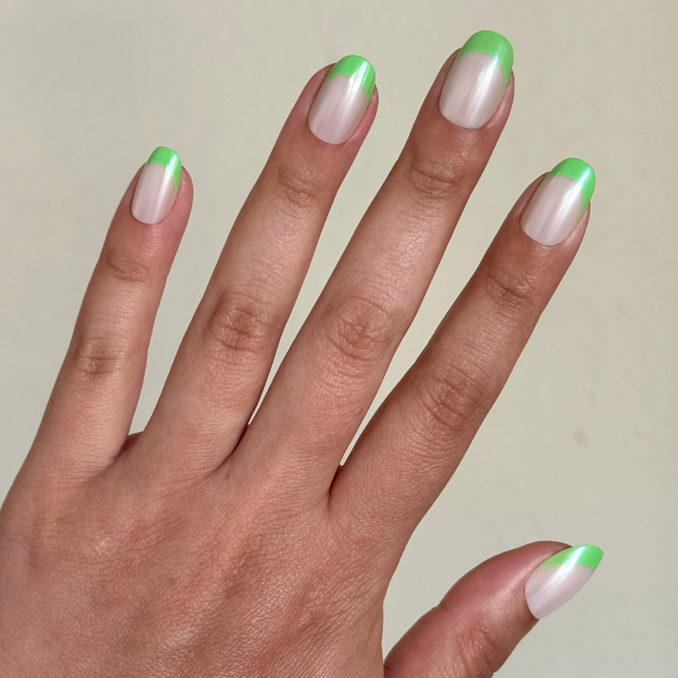 A sheer mani with a neon lime tip topped with shimmery chrome in a short round shape.