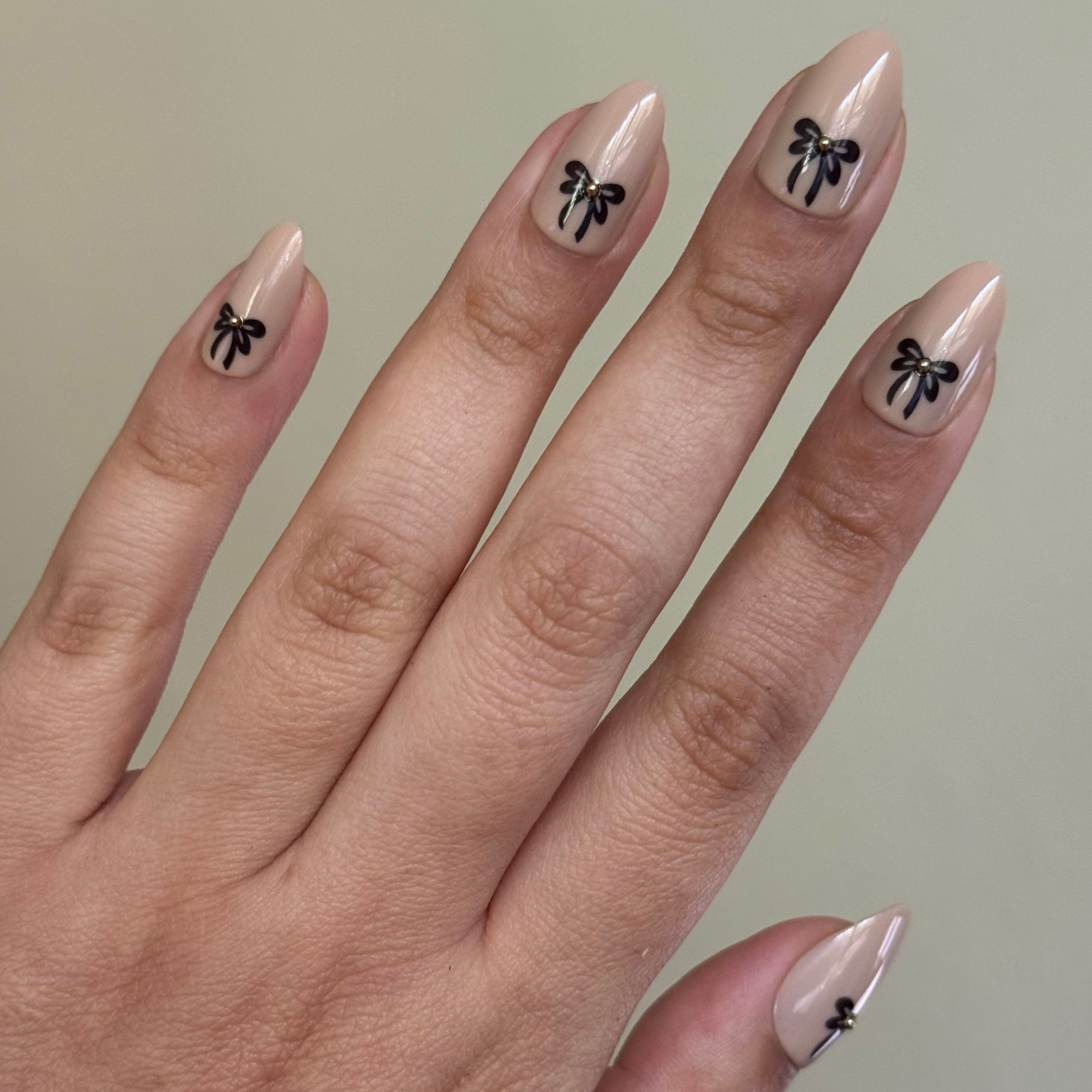 A creamy beige mani accented with bows and 3D puffy gems.