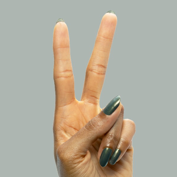 A deep olive green with a shimmery golden chrome finish. Always rolled — never shake your polish!