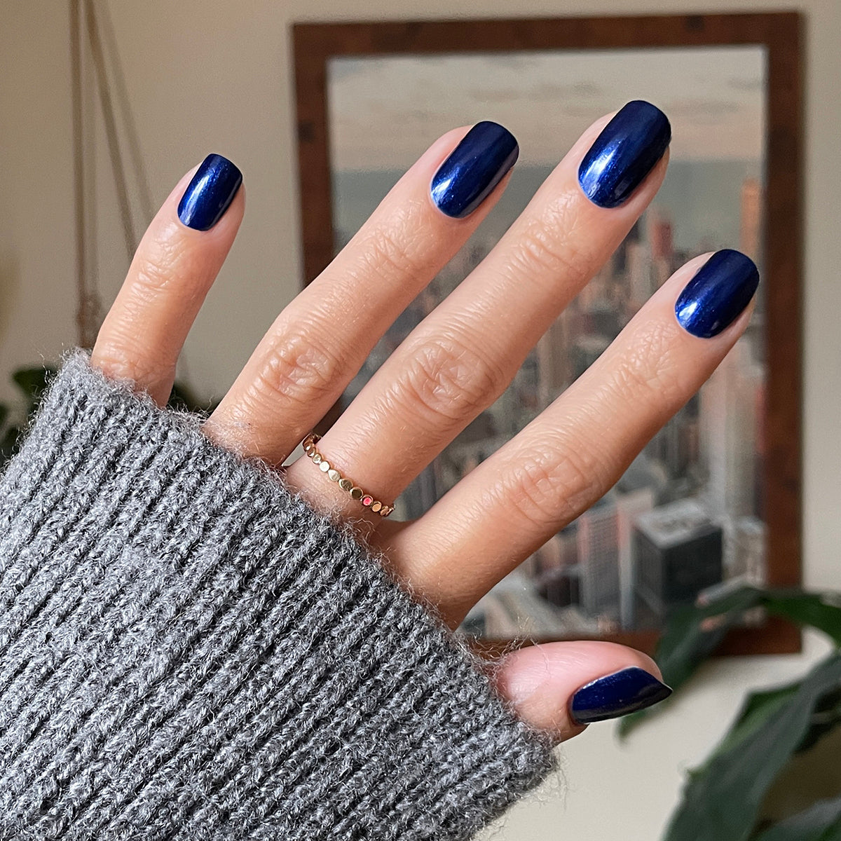 A shimmery metallic navy polish that shines like the night sky.