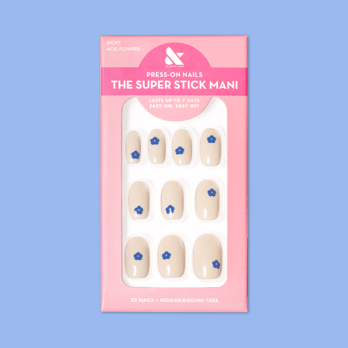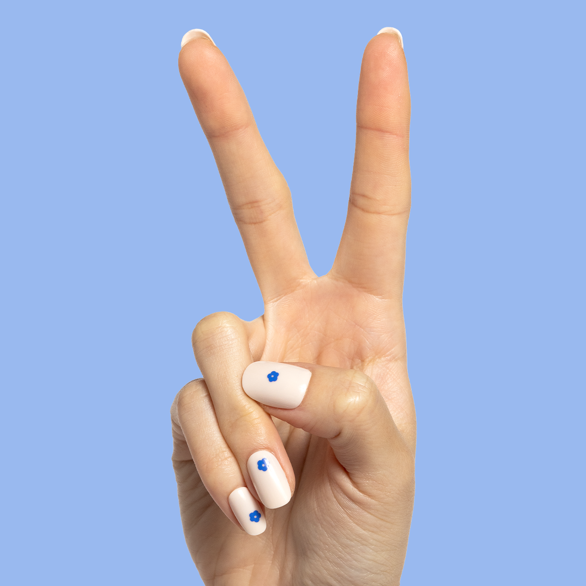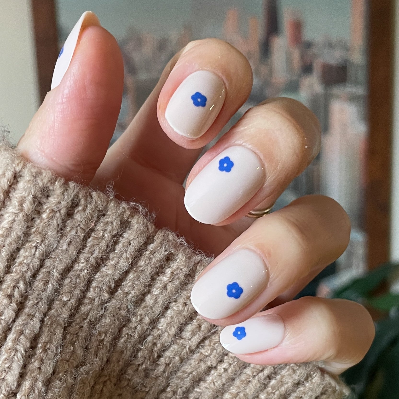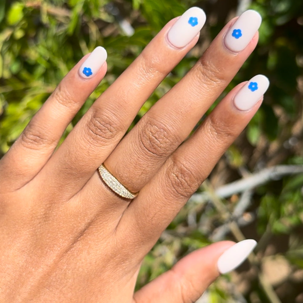A neutral mani accented by modern blue blooms.
