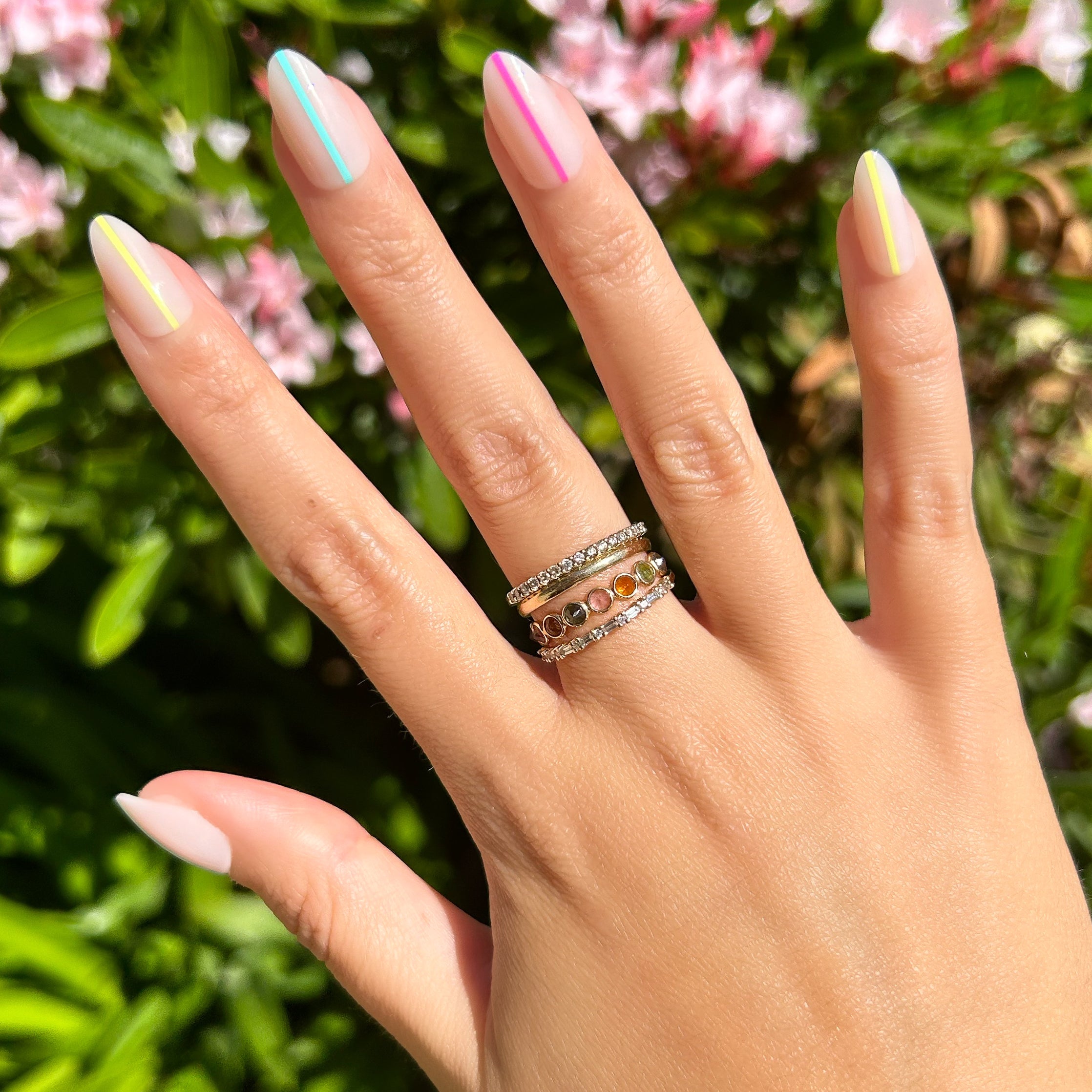 A neutral mani with pops of neon lines on a medium almond shape.