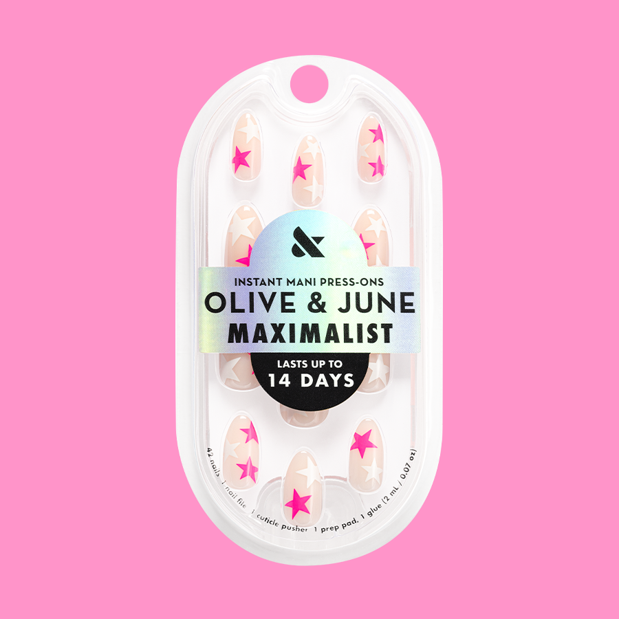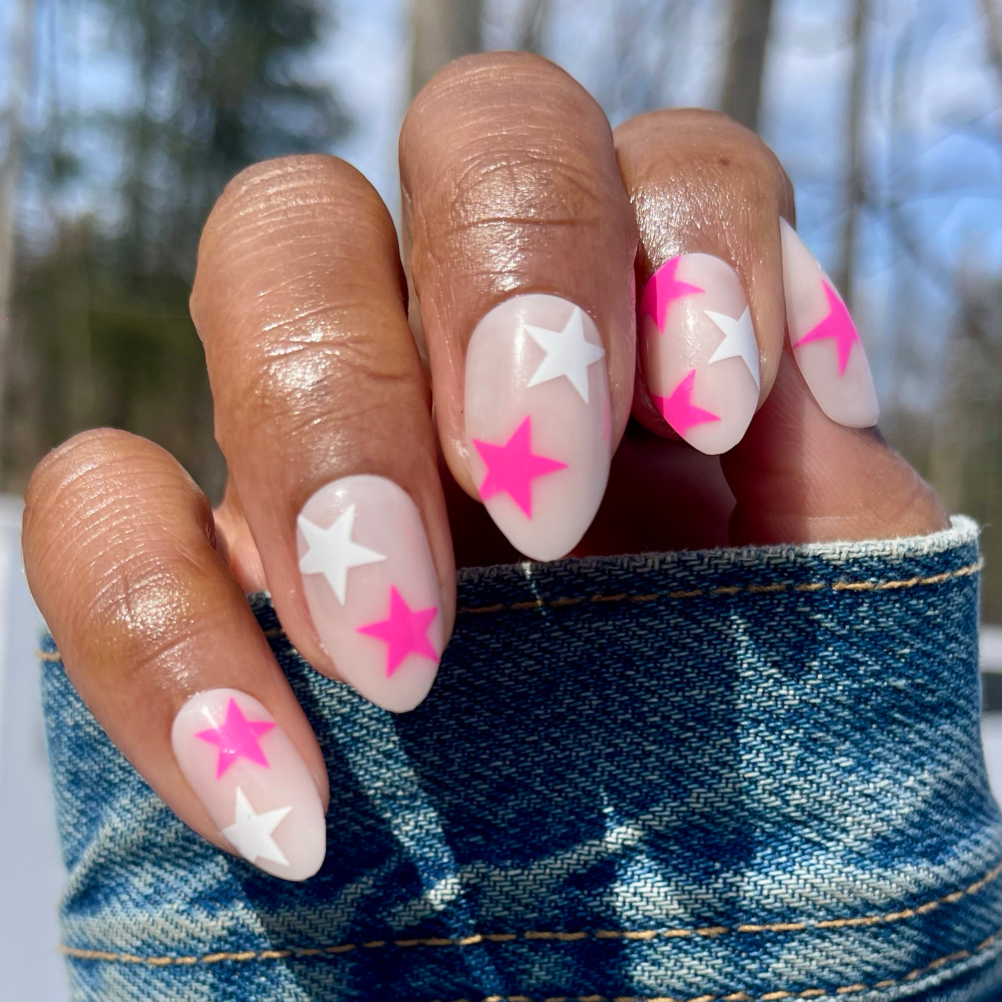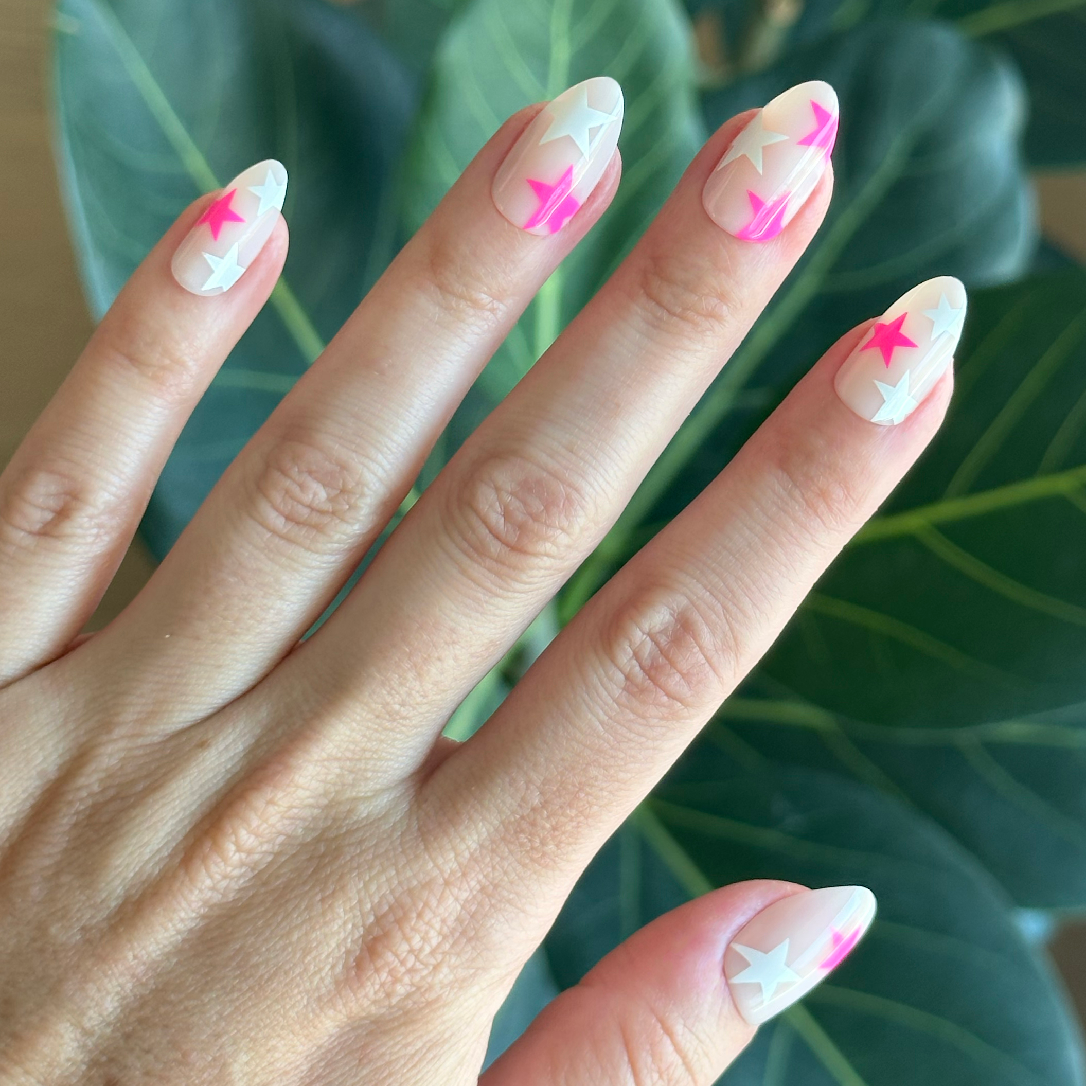A sheer neutral mani accented by crisp white and neon pink stars in a medium almond shape.