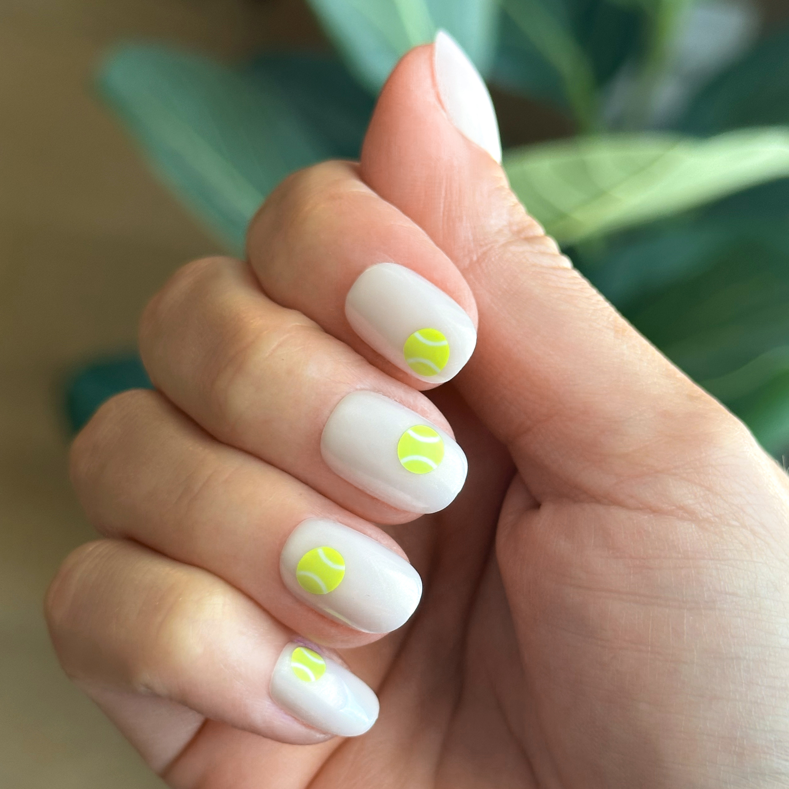 A neutral sheer mani with bright yellow-green tennis balls in an extra short squoval shape.