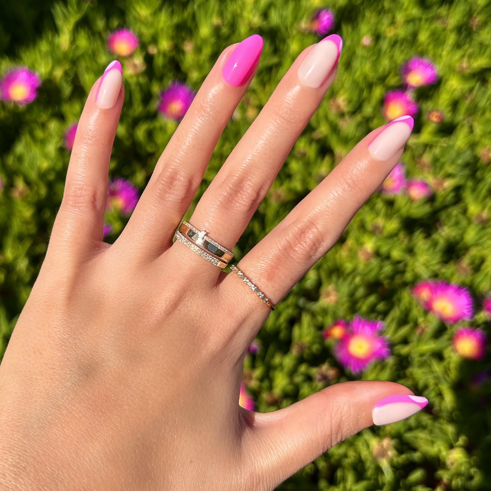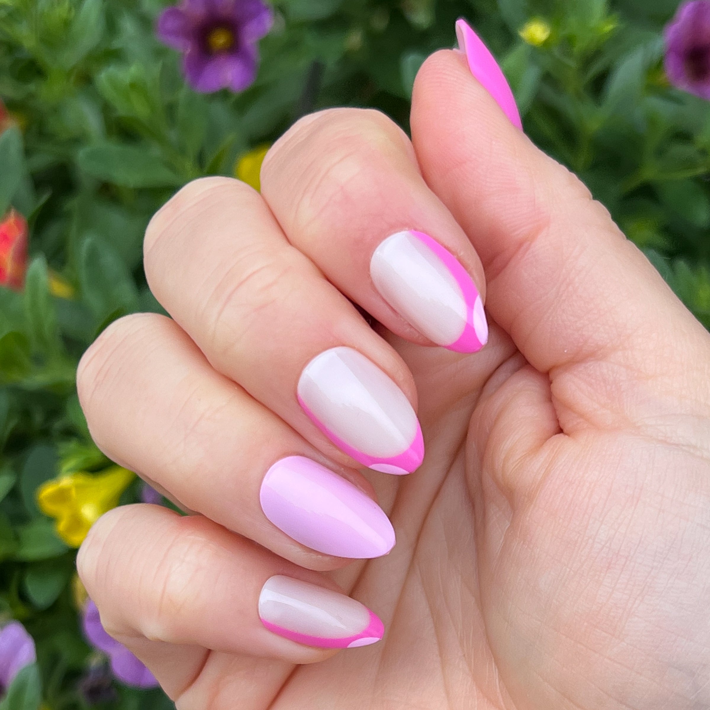 A celebration of all things pink and french in medium almond shape.