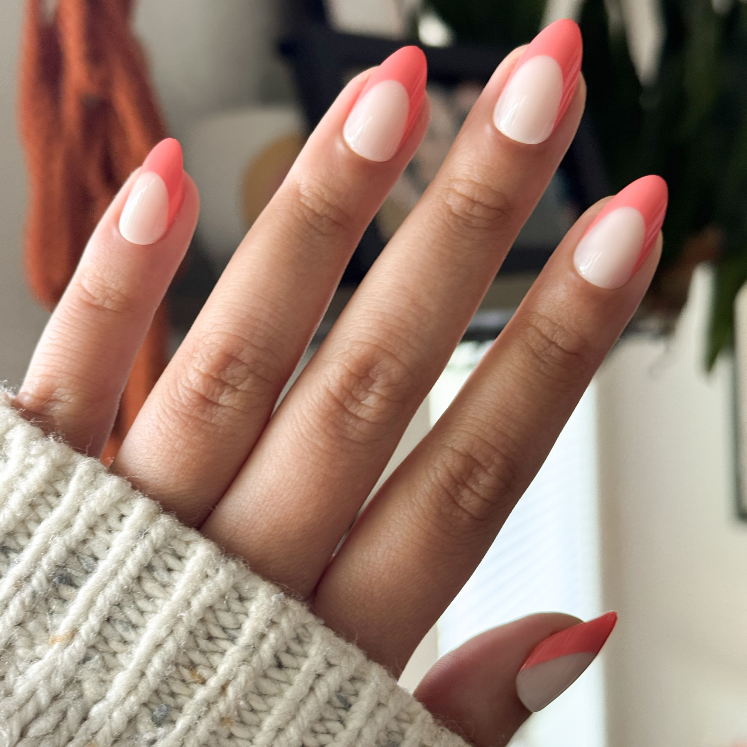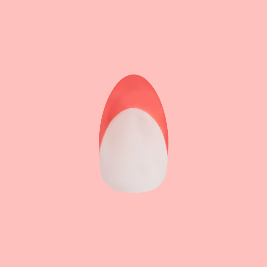 A sheer neutral mani with a bright coral french tip in a medium almond shape.