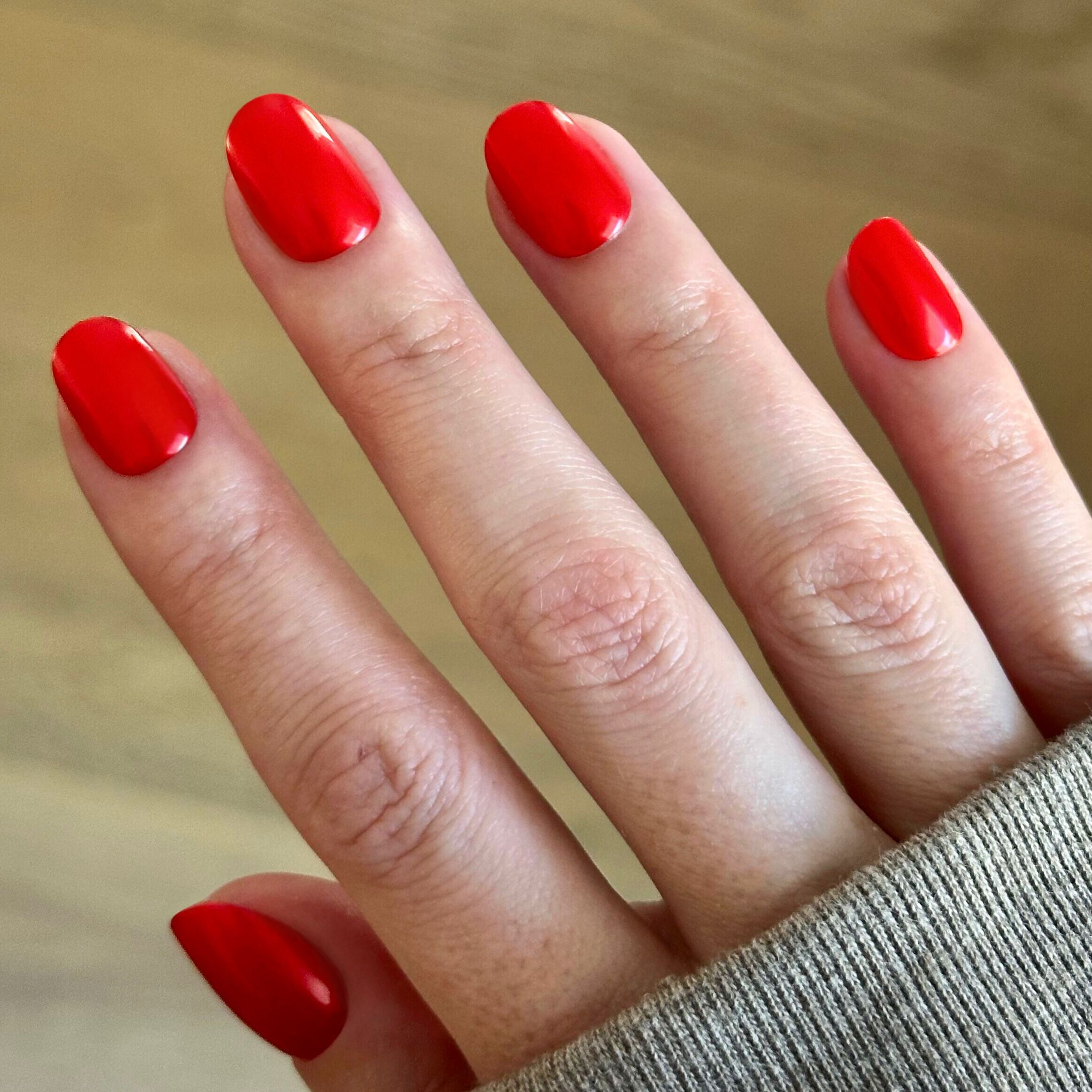 A true red mani with a chrome effect in an extra short round shape.