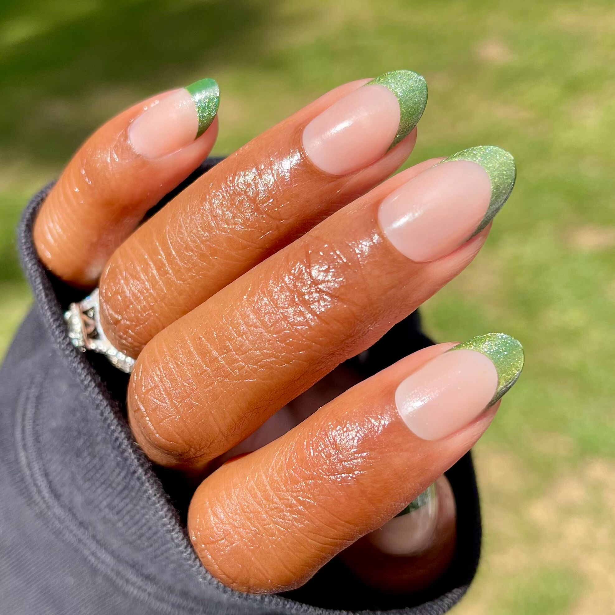 A velvet magnetic effect sage green french mani a medium oval shape.