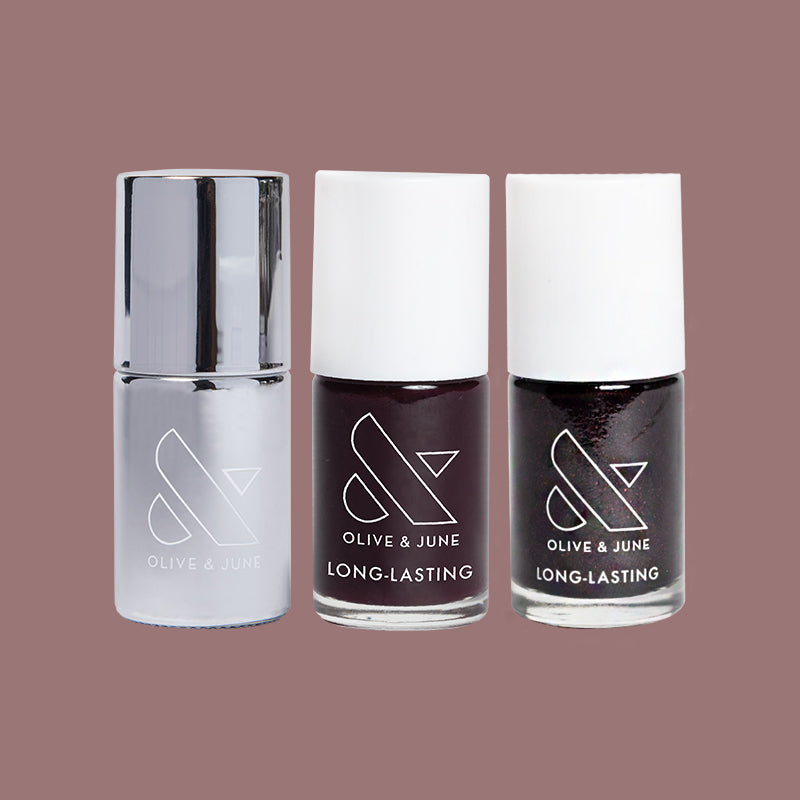 A shimmery oxblood mani with a — you guessed it — shiny patent finish.