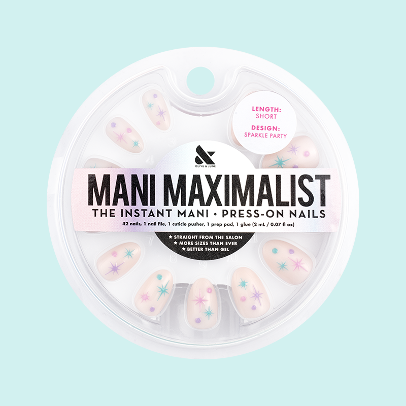 A sheer neutral mani with candy-colored sparkles in a short almond shape.