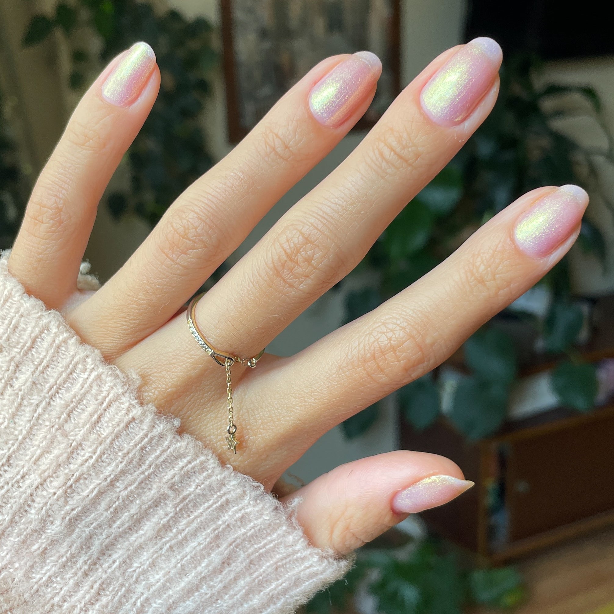 A sheer and shimmery pink iridescent polish that’s sweet on its own. but even sweeter as a topper.