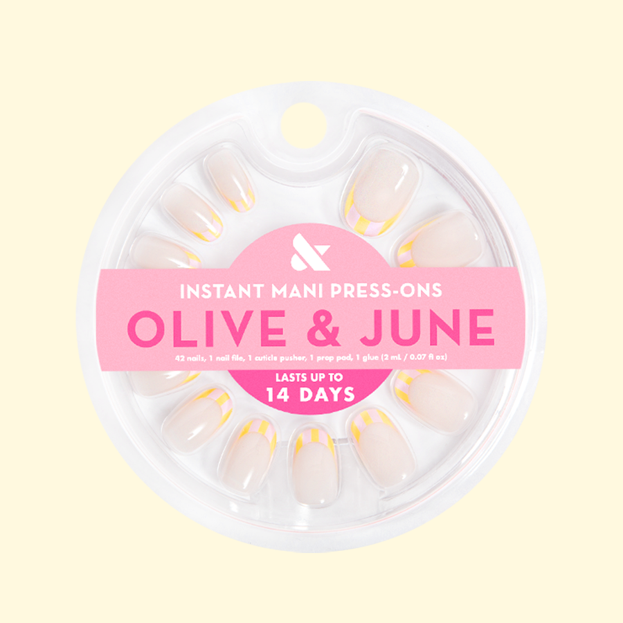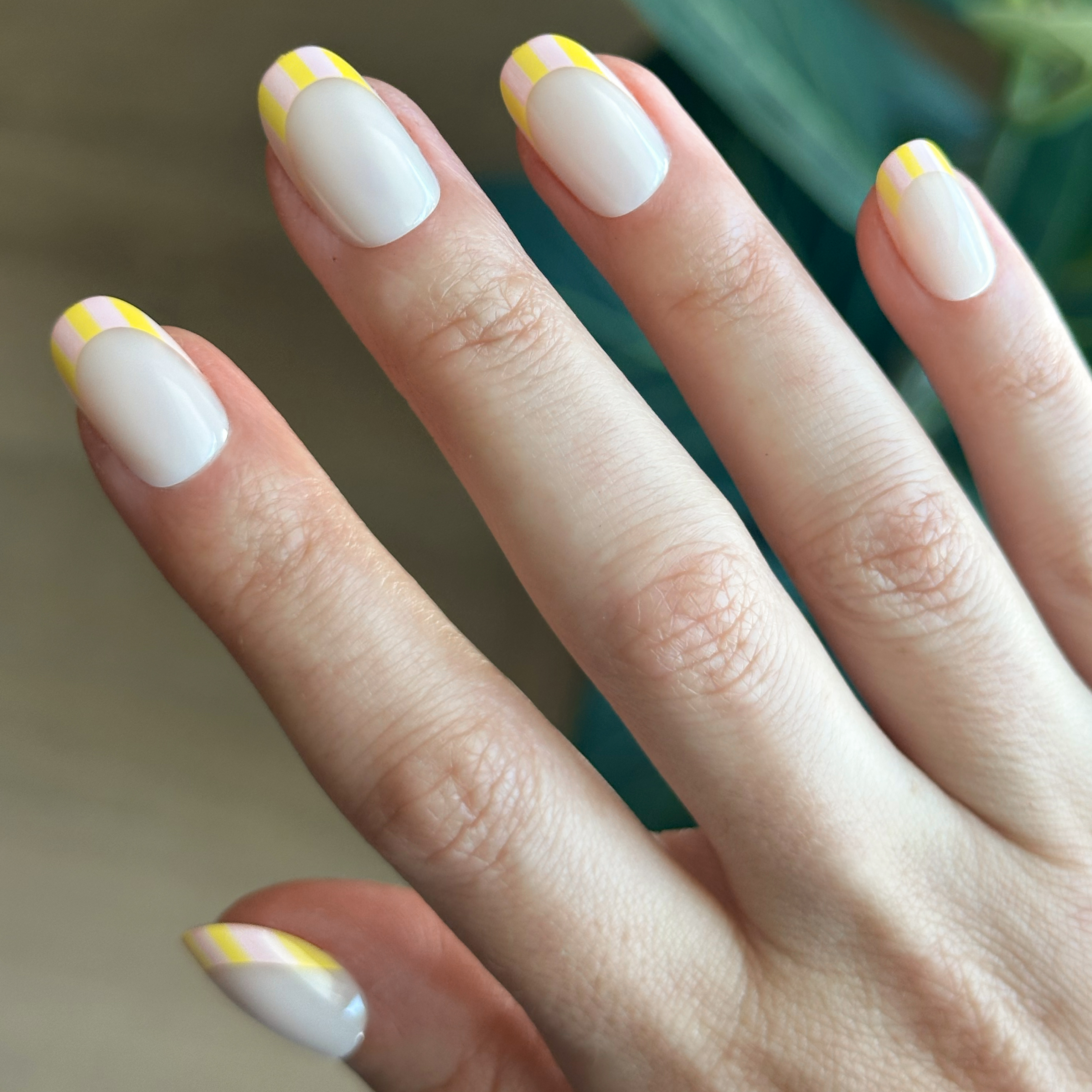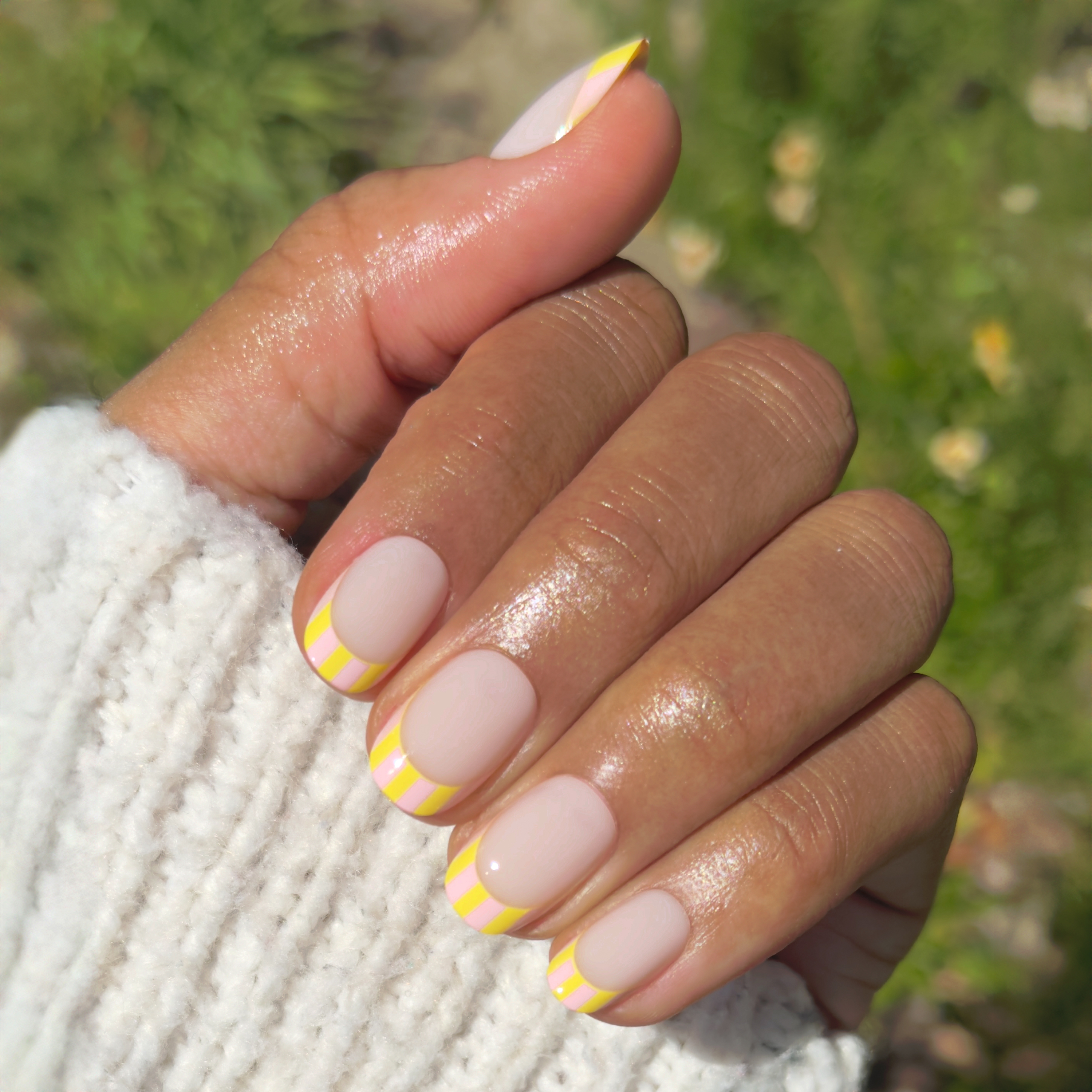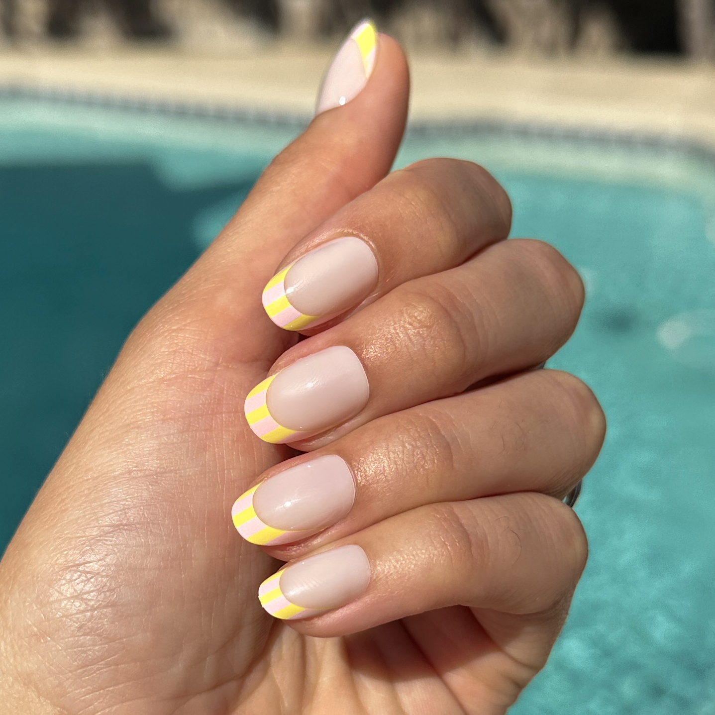 A milky sheer mani with a colorful citrus striped french tip in a short round shape.