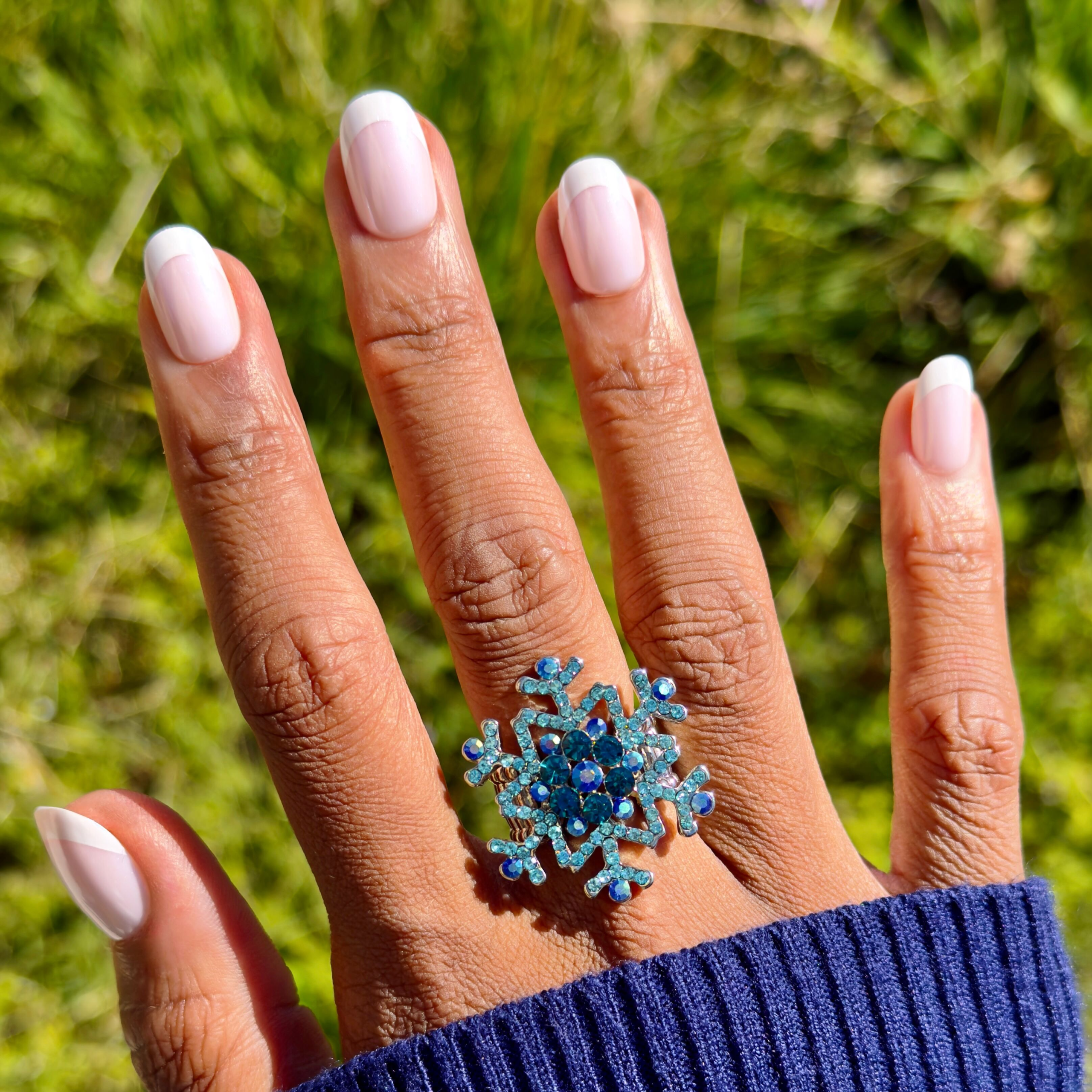 A classic french mani topped with shimmering chrome in a short round shape.