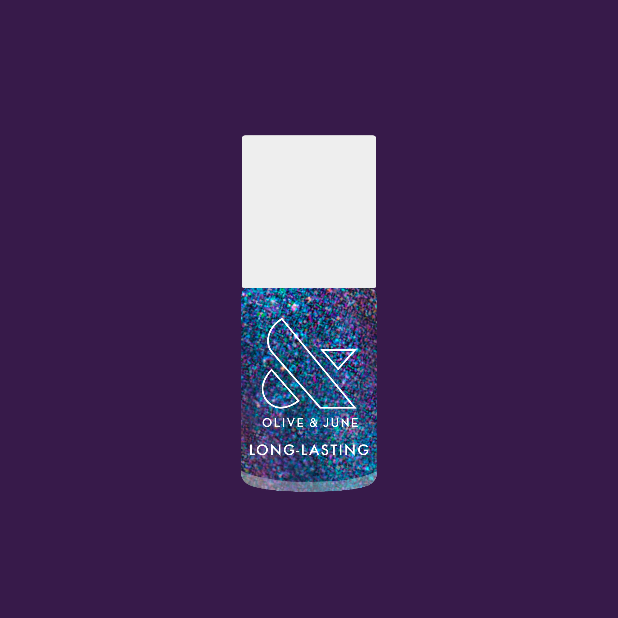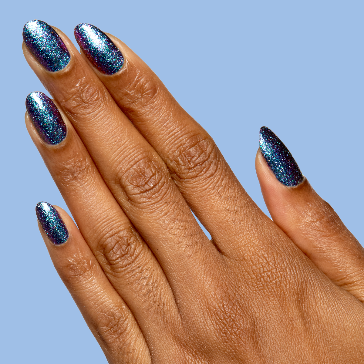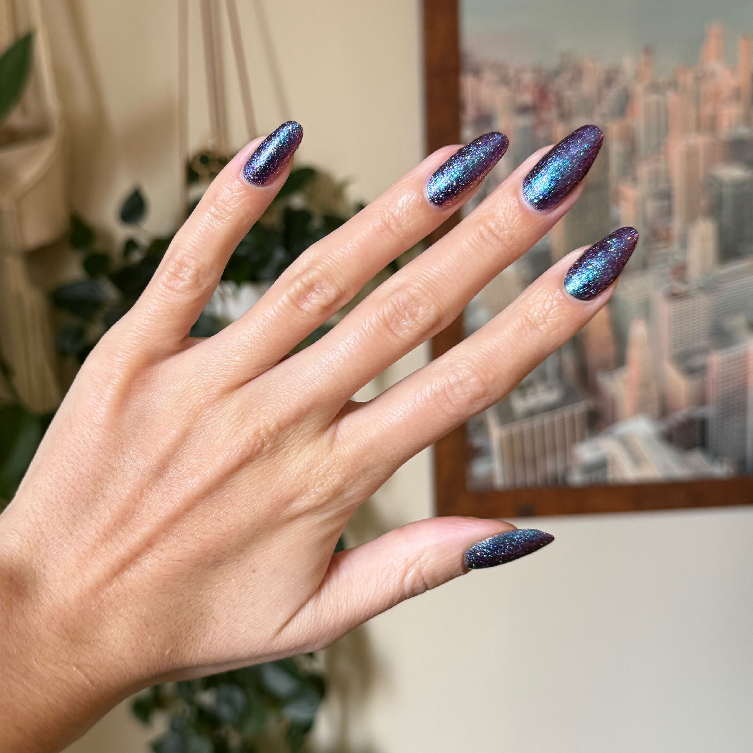 An iridescent glitter polish with a purple-blue shift that is not a want. but a need.